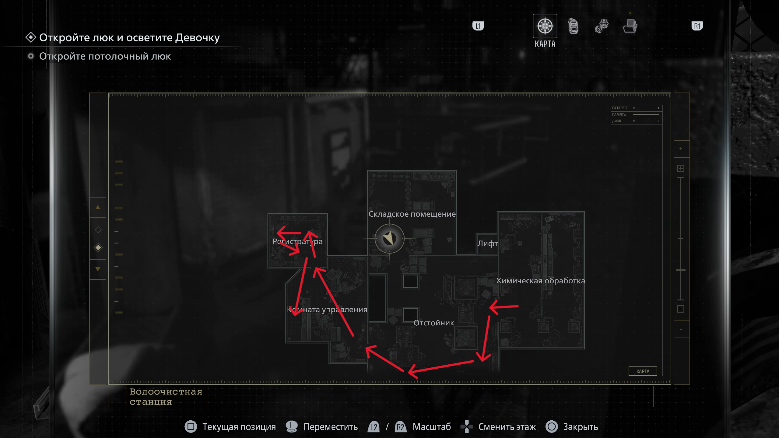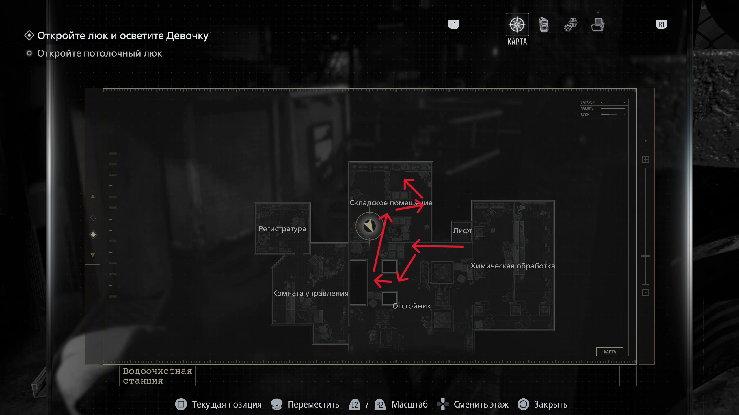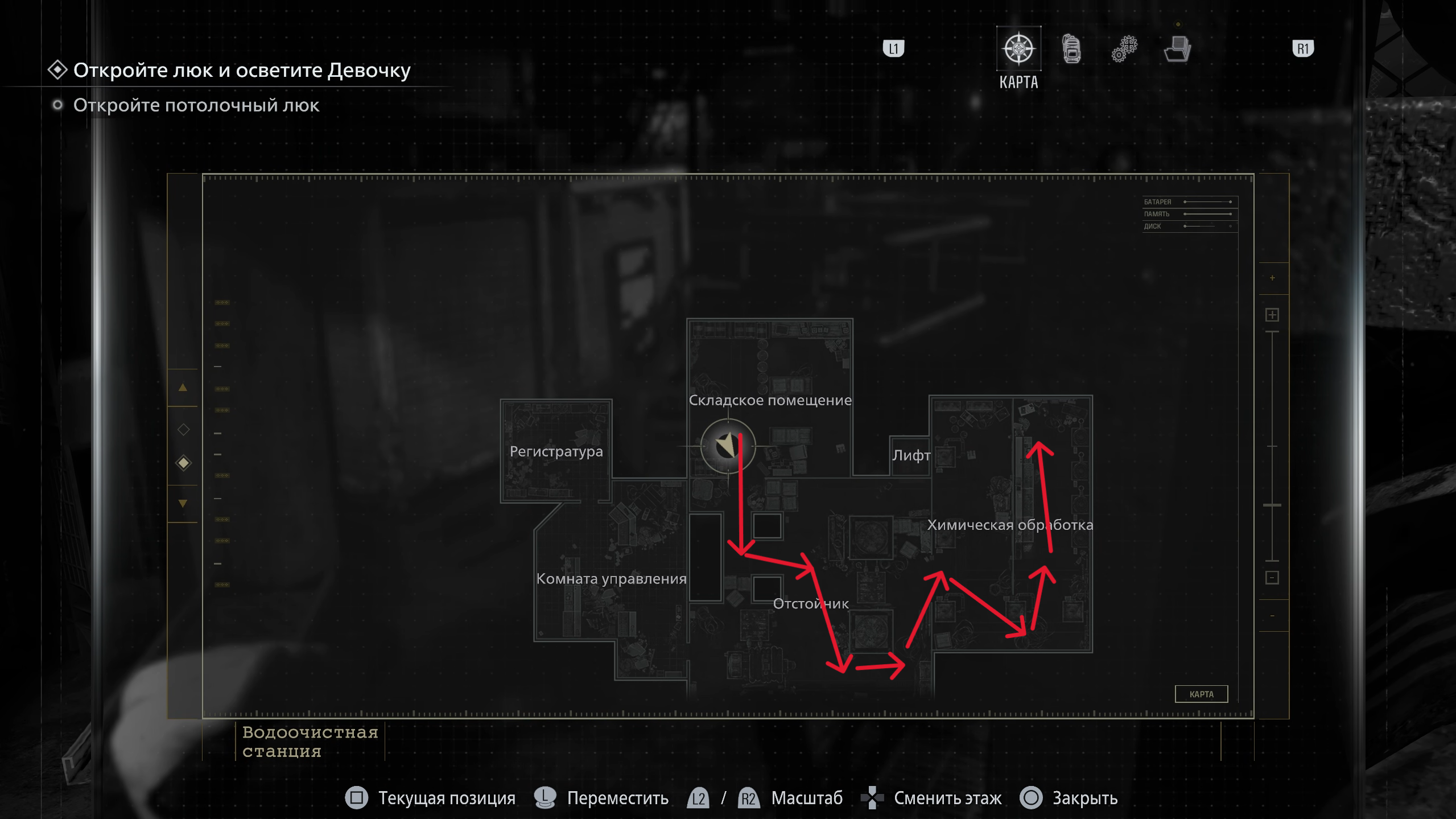 В коридорах он устранил нескольких бледных заражённых и двинулся дальше. Самочувствие ухудшалось — тянуть было нельзя. В просторном помещении за коридором он подобрал справа ручную гранату и вошёл в безопасную комнату напротив. Здесь находились медицинский инъектор, ящик снабжения и ящик с ресурсами. На стене висела схема помещений. Ему нужно было попасть в центральную систему очистки «Пандора».