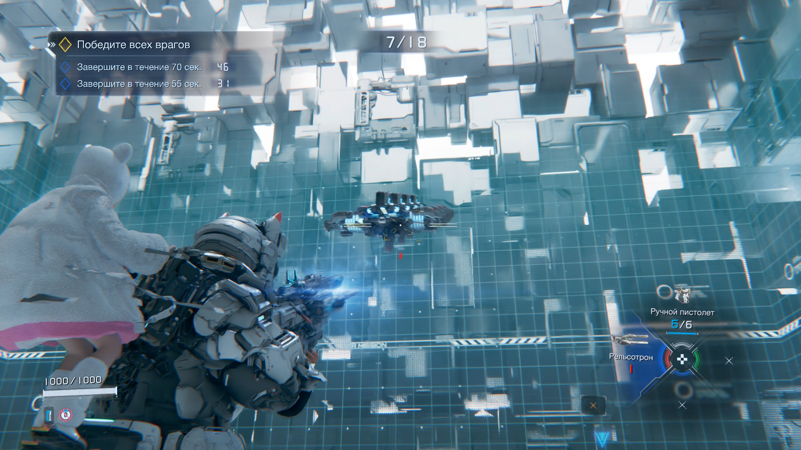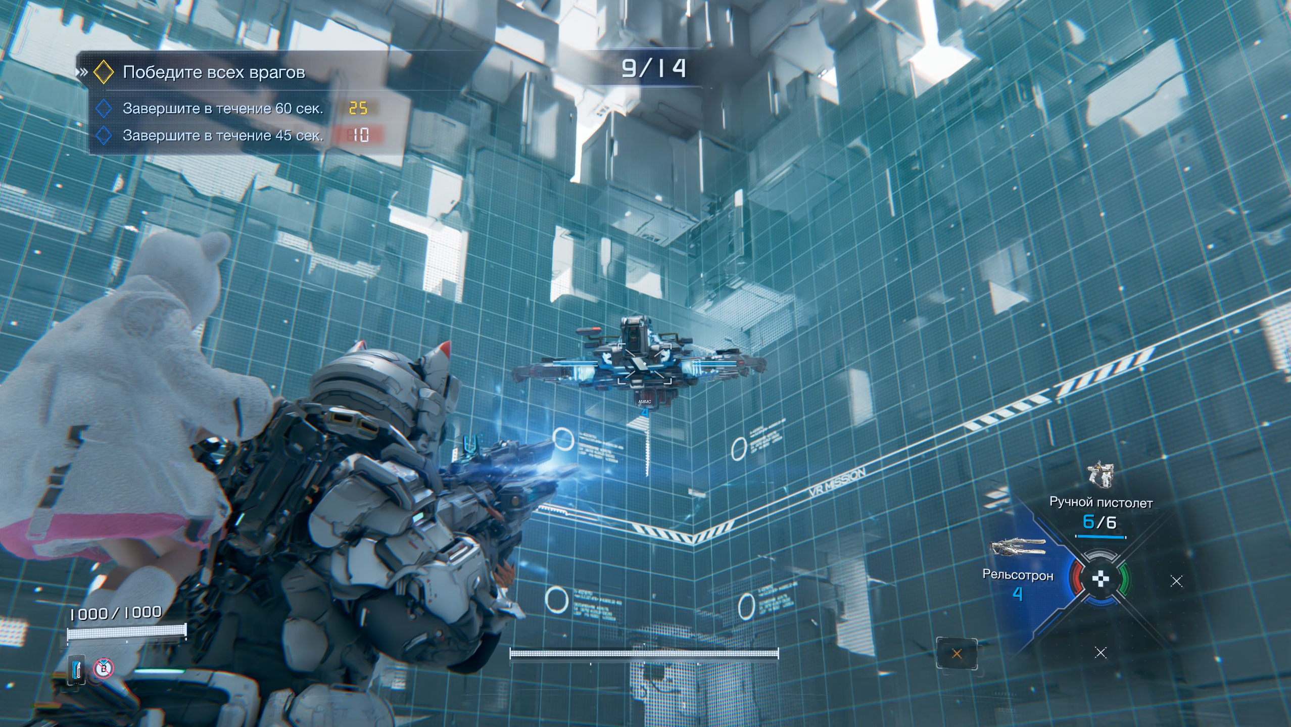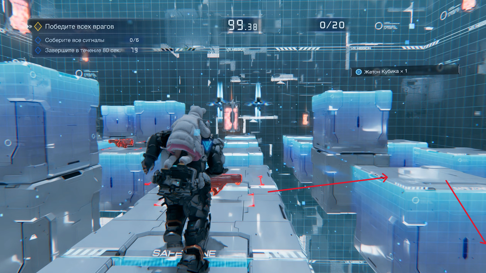 В этом испытании нужно пережить четыре волны врагов. После каждой из них арена перестраивается: одни блоки исчезают, другие появляются, поэтому важно не только быстро стрелять, но и всё время смотреть под ноги, чтобы не свалиться вниз. Зоны, которые не перестраиваются, подписаны как Safe Zone — обращайте на это внимание.