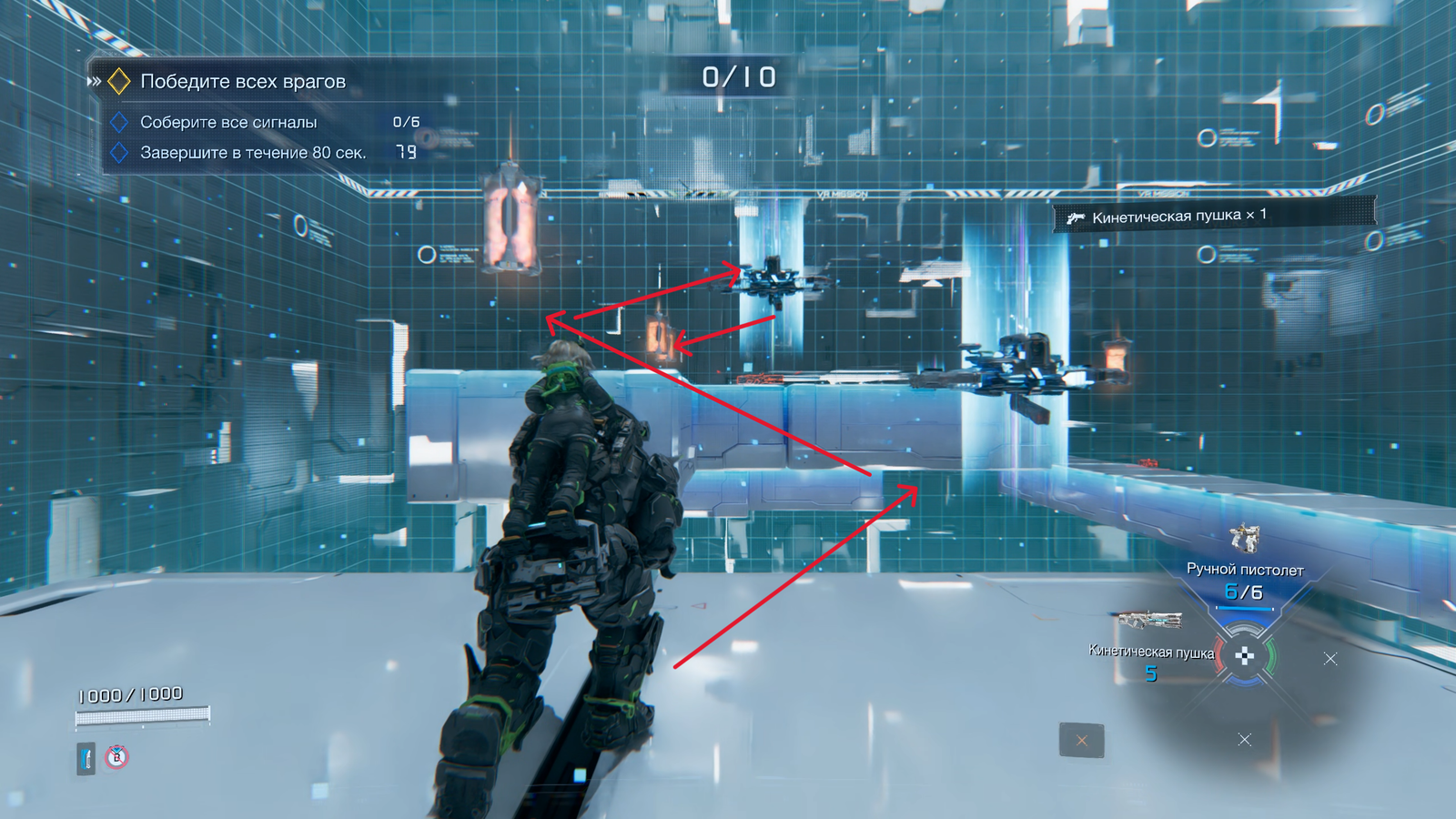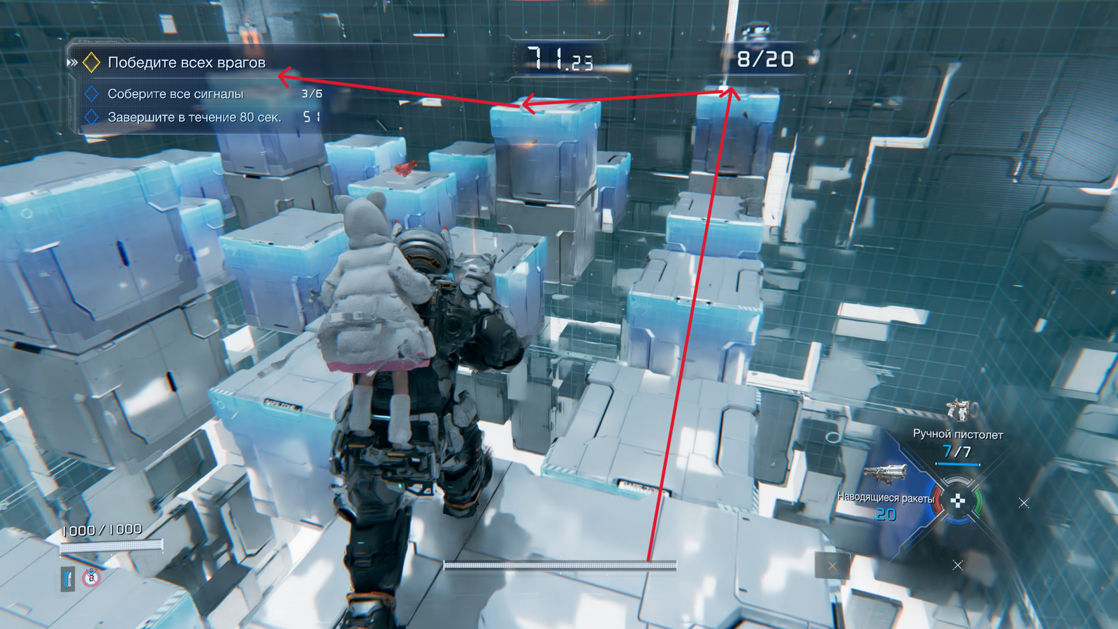 На стартовой точке подберите сигнал и Наводящиеся ракеты, затем выстрелите в двух ближайших Наблюдателей. После этого, не сходя с места, прицельтесь в двух Наблюдателей, появившихся правее. Теперь можно перепрыгивать на платформу справа, а затем ещё раз вправо — там будет второй сигнал. Дальше от этой платформы двигайтесь строго против часовой стрелки по квадрату, собирая сигналы и стреляя в Наблюдателей. В итоге вы сделаете круг, заберёте последний, шестой сигнал на платформе слева от стартовой точки и там же расстреляете оставшихся шестерых Наблюдателей.