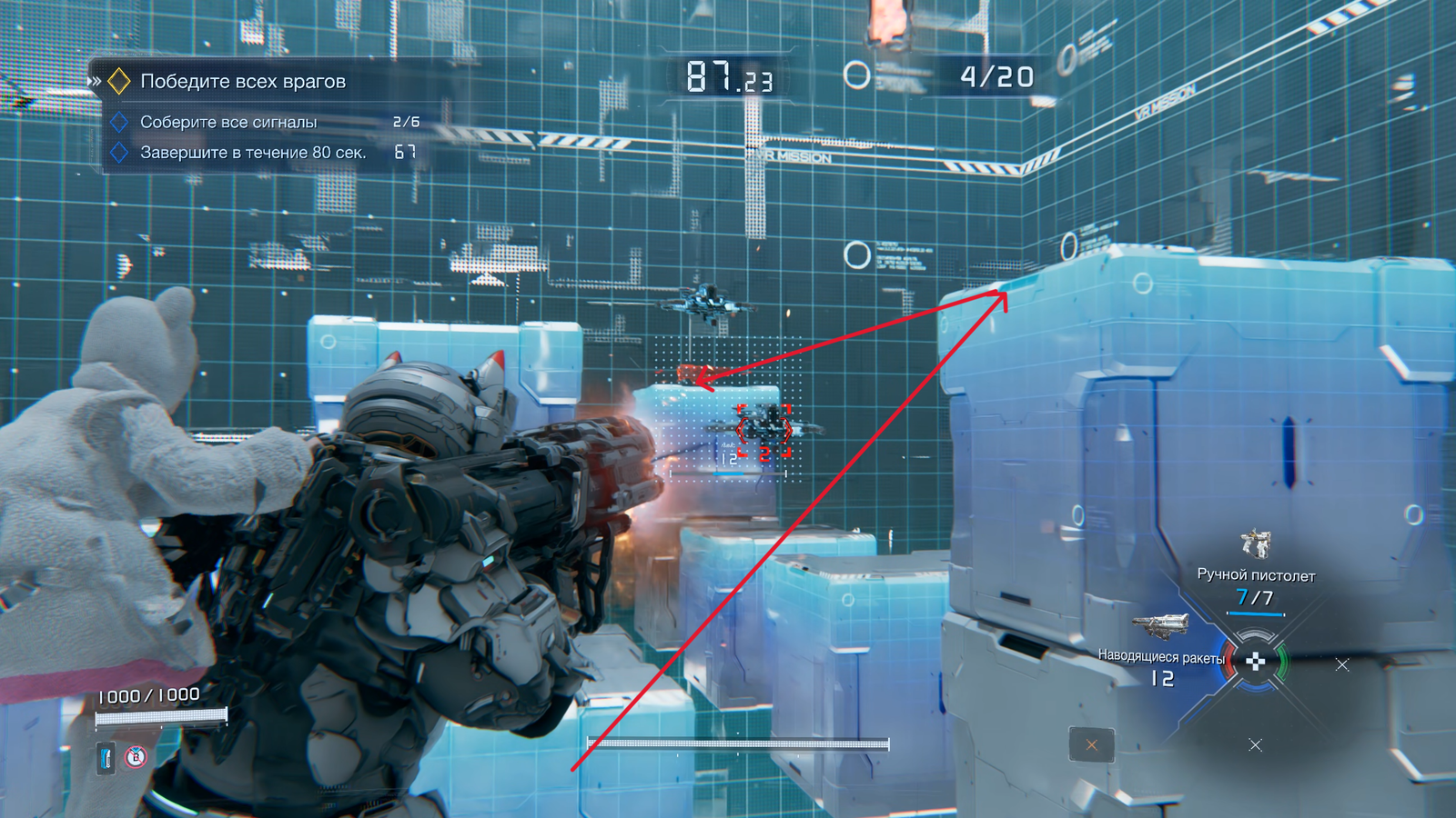 Здесь вам нужно, используя Наводящиеся ракеты, устранить 20 Наблюдателей и собрать сигналы по пути. Наводящиеся ракеты автоматически летят к цели после того, как зафиксируют её, поэтому стрелять можно хоть в движении, хоть в прыжке, и это важно учитывать, чтобы уложиться по времени. При этом для уничтожения одного Наблюдателя достаточно выпустить в него две ракеты.
