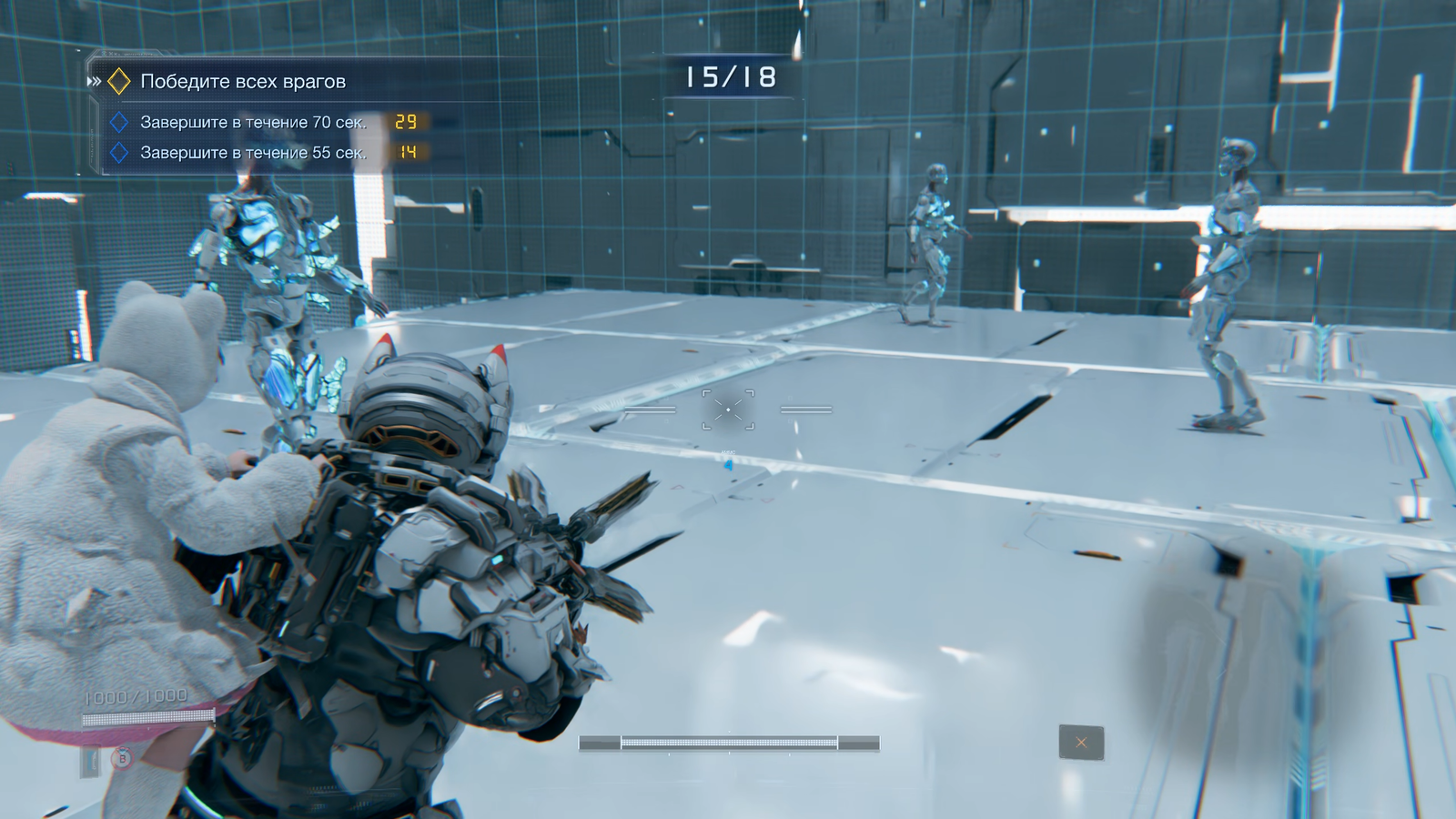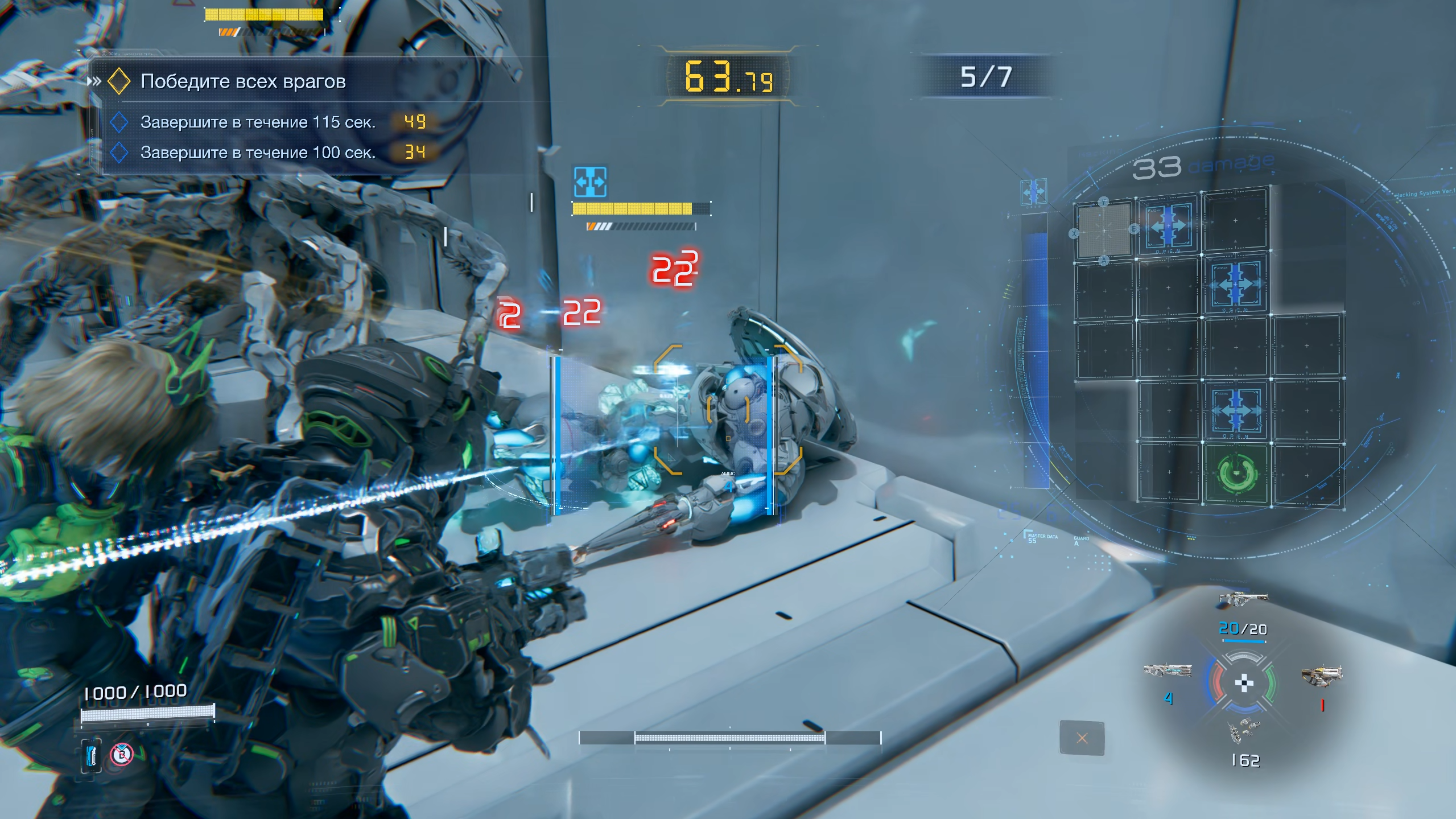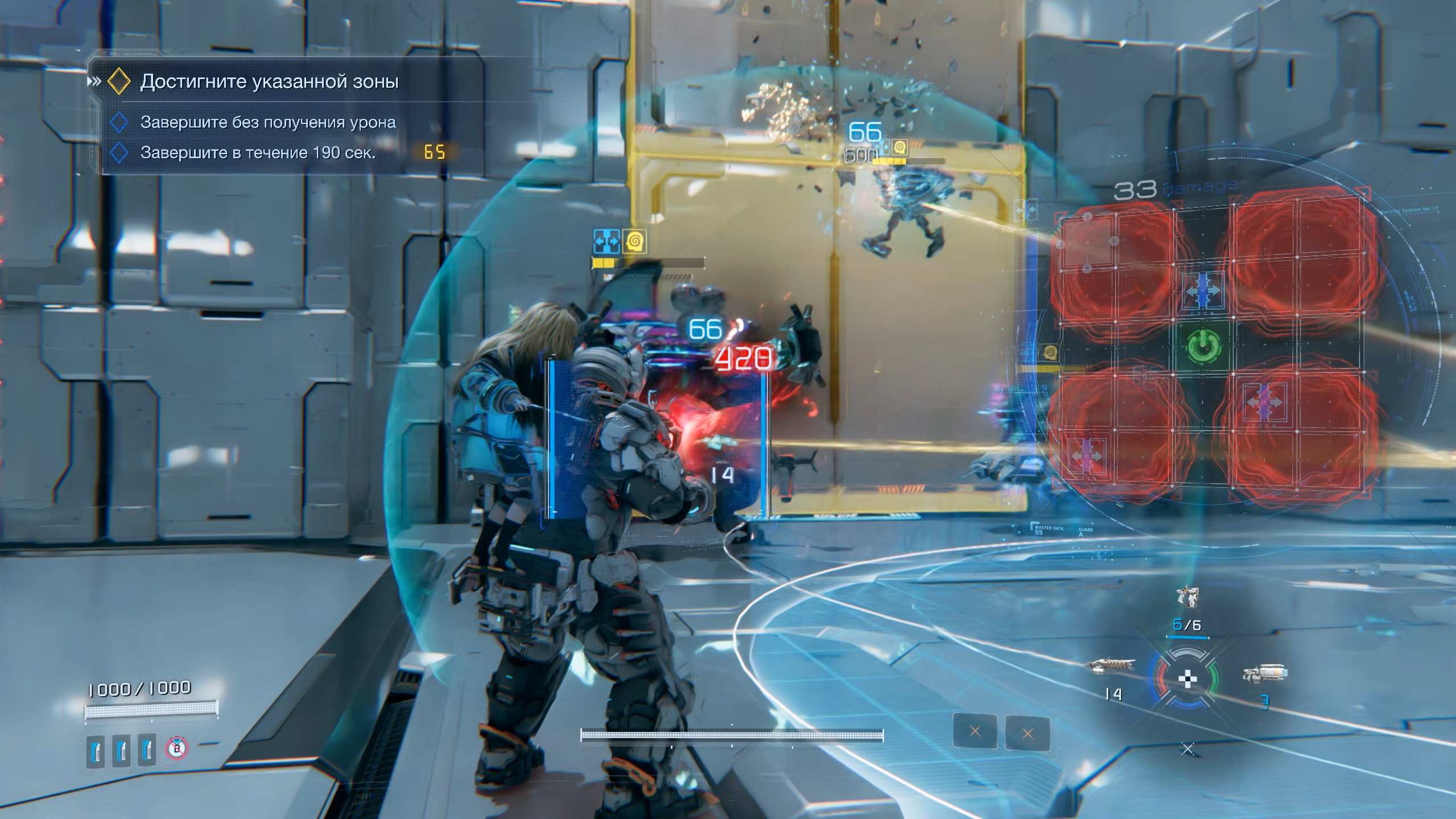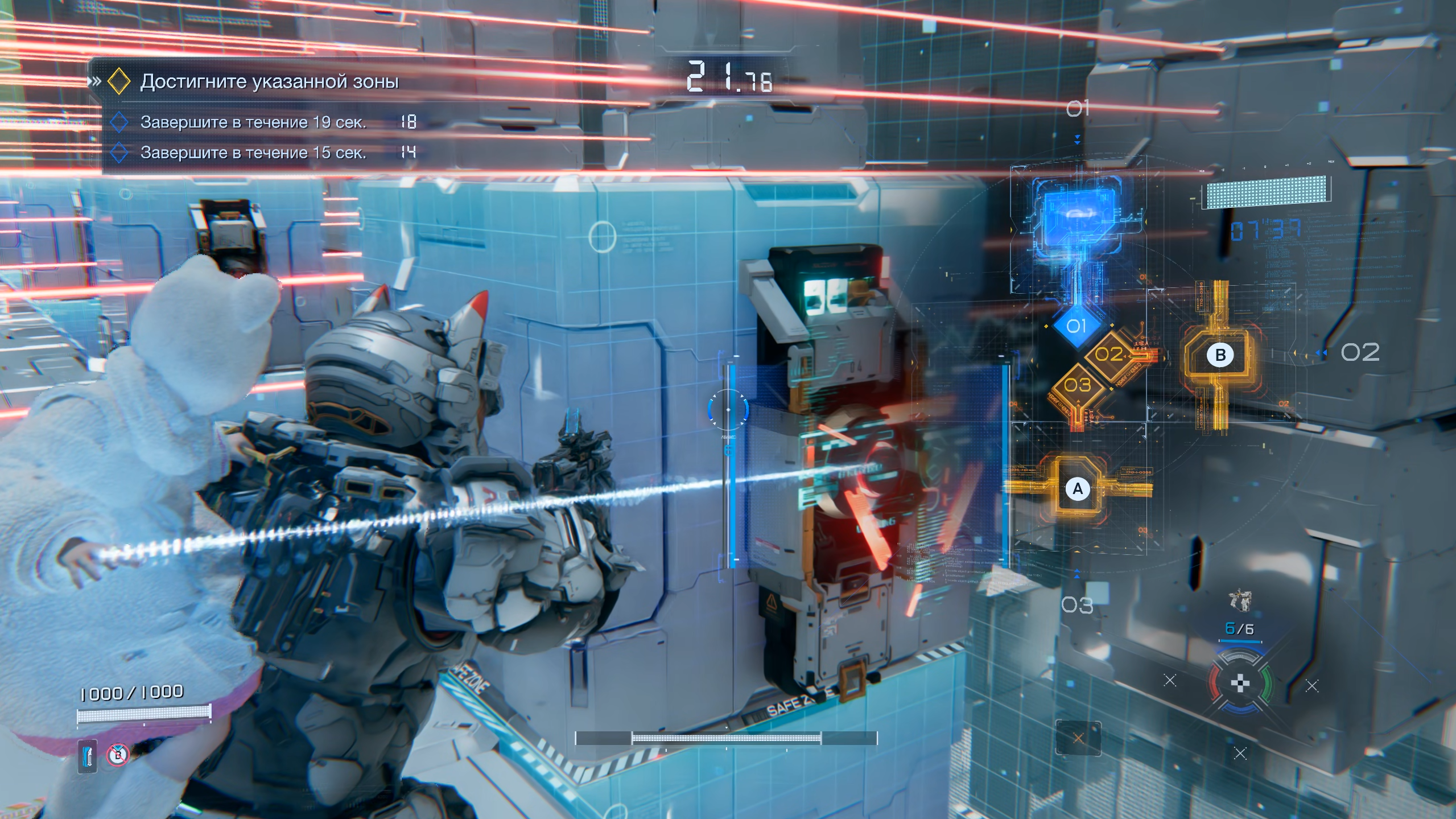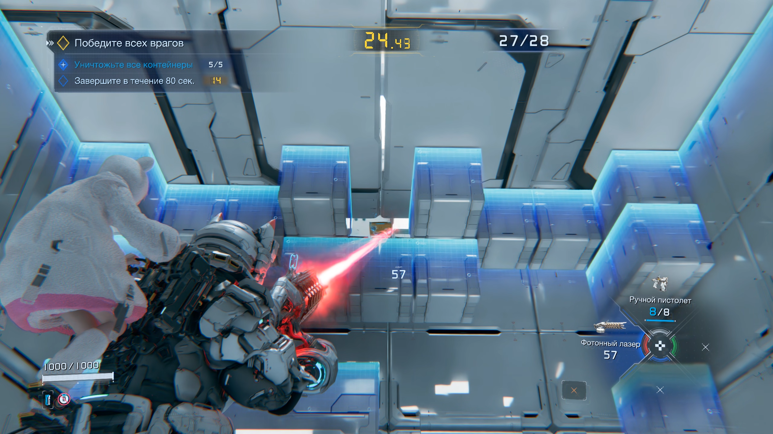В этом испытании вам нужно уничтожить 28 противников и 5 контейнеров с помощью Фотонного лазера. Весь бой вы будете находиться на одной платформе, где разбросано несколько пушек. Смело зажимайте кнопку выстрела и переводите огонь с одной цели на другую. Если будете отпускать курок, оружие уйдёт на перезарядку, и вы потеряете драгоценные секунды, поэтому лучше постепенно перемещаться по краю площадки, чтобы подбирать новое оружие, как только закончится боезапас.