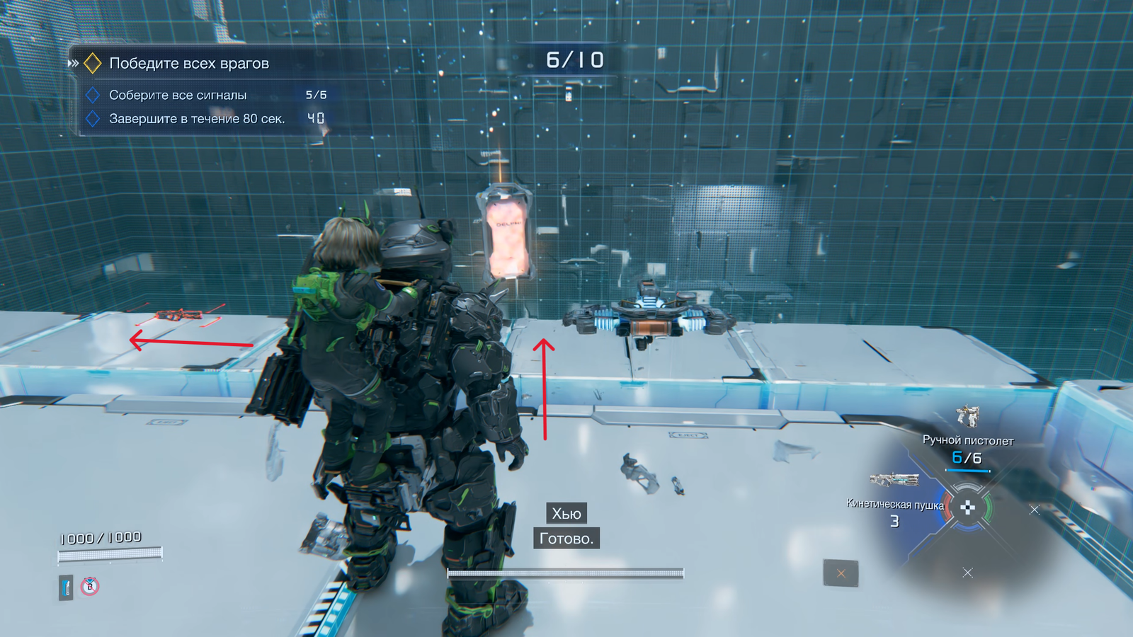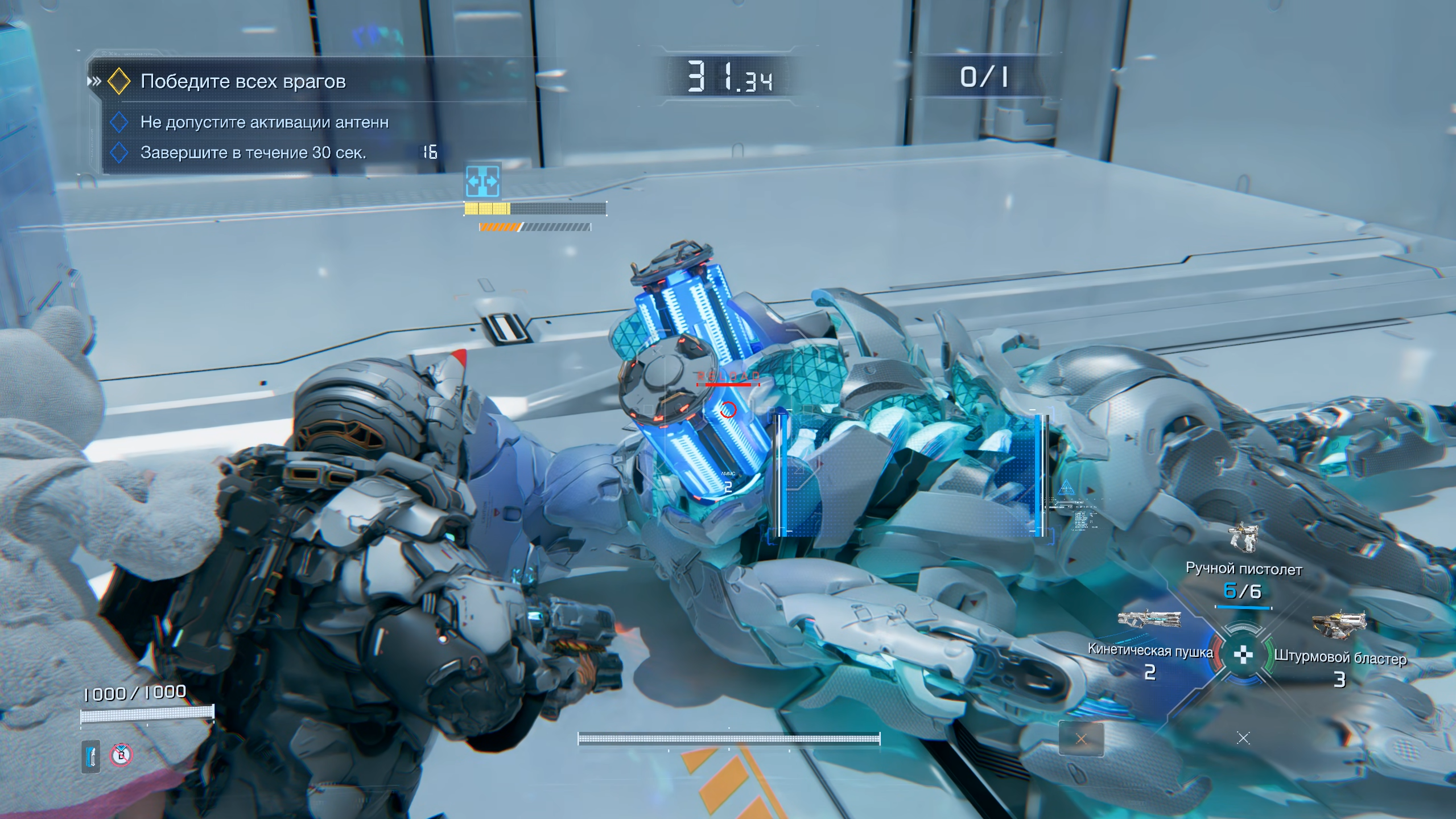 Здесь нужно одолеть три волны противников. В первой волне будет один Крушитель, во второй — два Наблюдателя MK-II, а в третьей — два Исполнителя. Именно с ними связано дополнительное условие про активацию антенн.