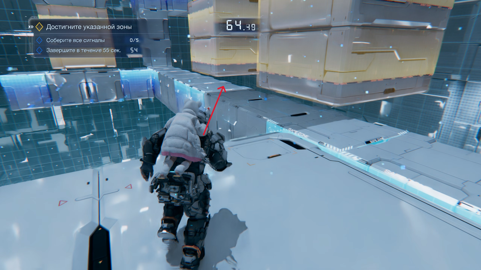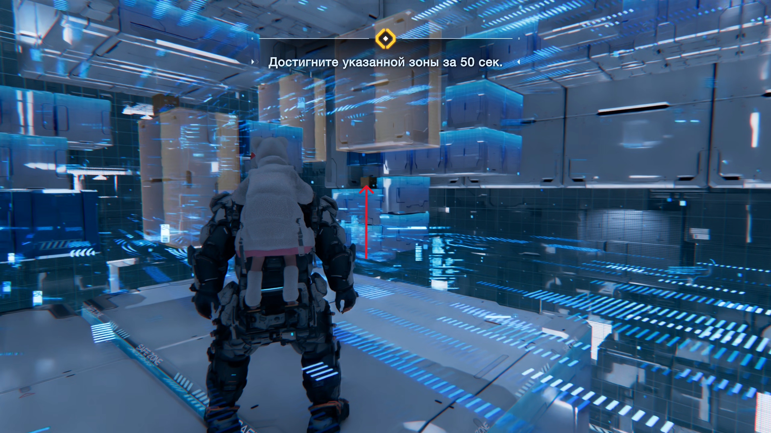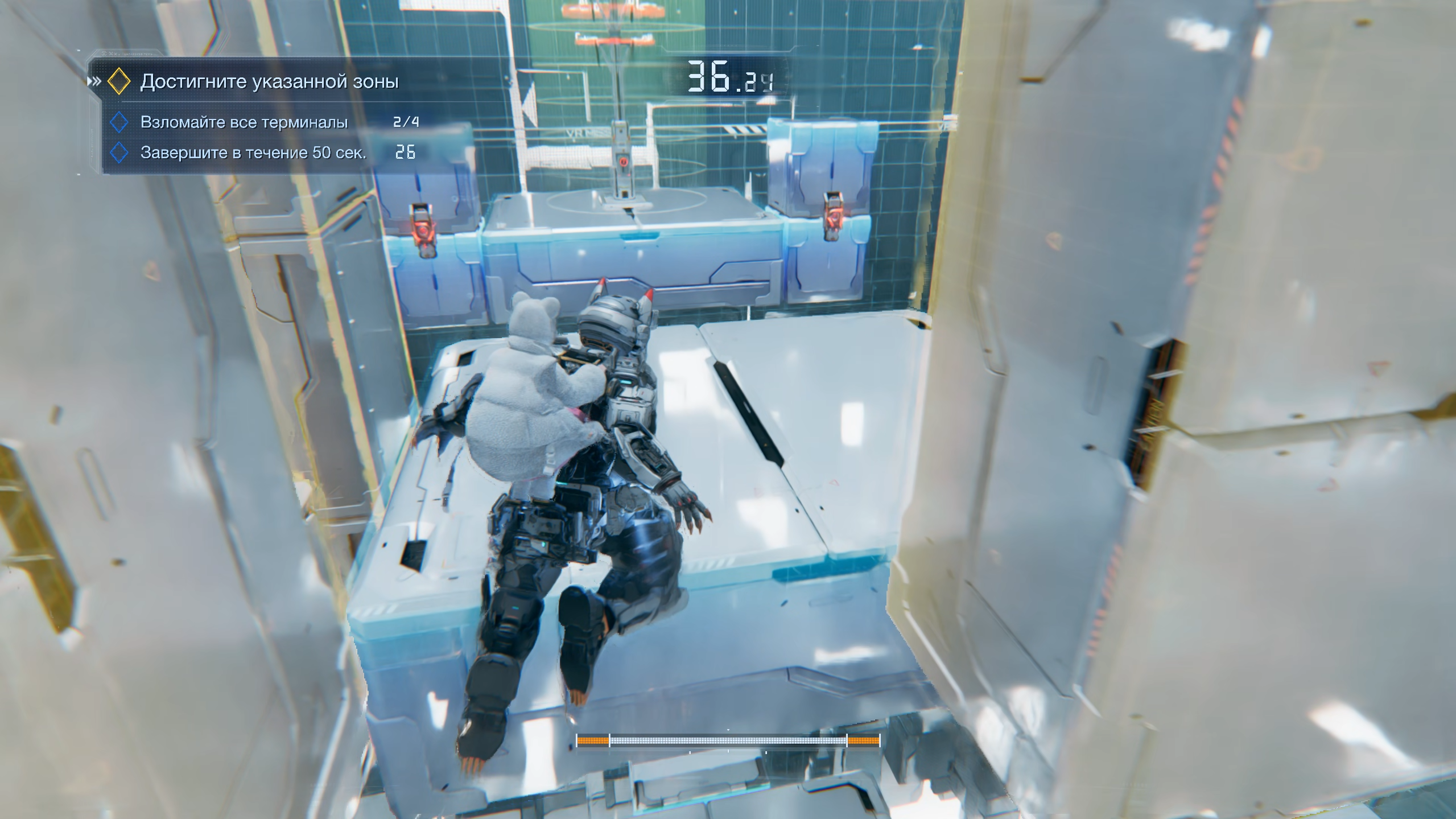 После старта перепрыгните на следующую платформу и взломайте терминал на стене справа. Второй терминал находится слева от поднимающейся платформы — его можно взломать, спокойно стоя на месте, но, если хотите сэкономить пару лишних секунд, можно сделать это во время подъёма на платформе наверх.