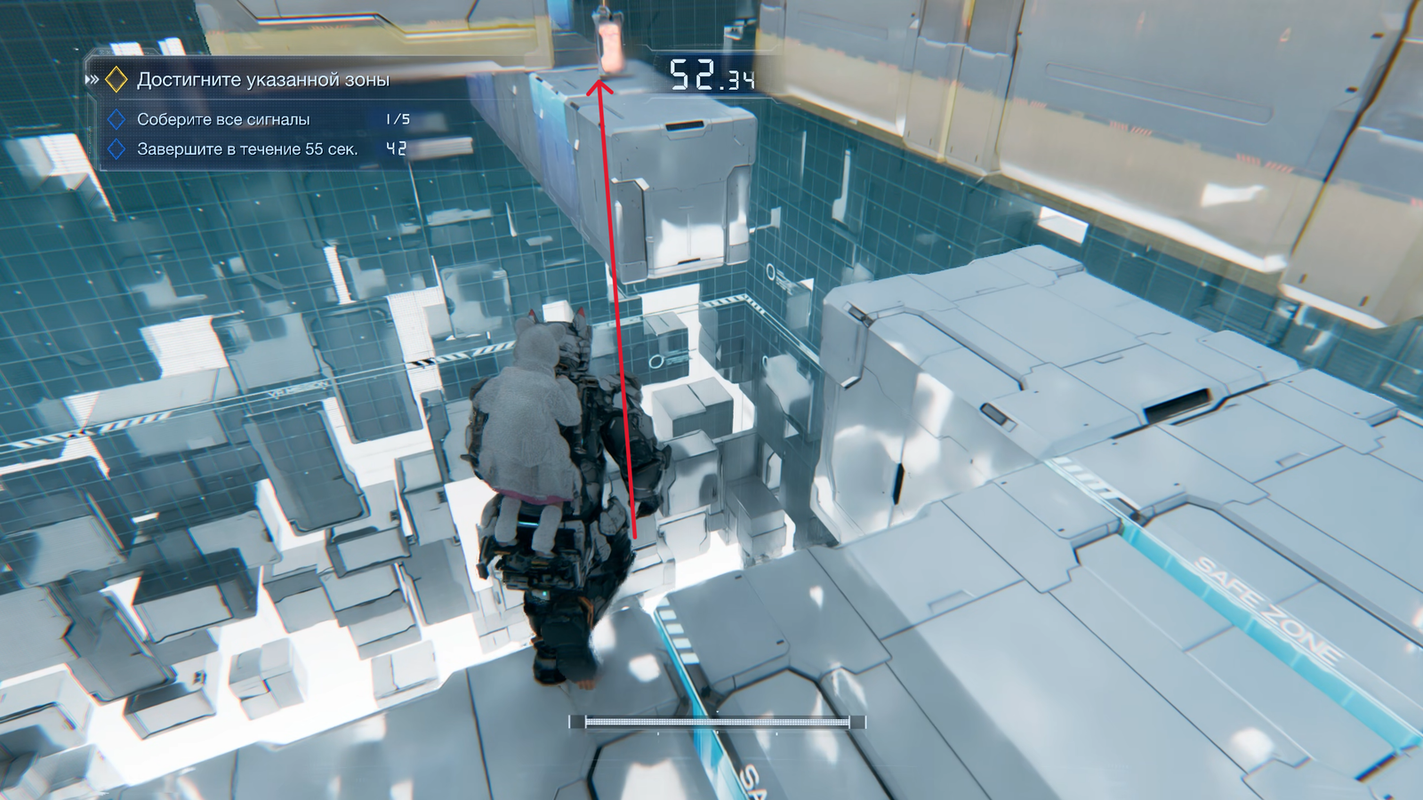 Дальше поднимайтесь наверх на платформе и продолжайте движение вперёд. На участке с движущимися блоками старайтесь метить в визуальный центр, чтобы не упасть с края. В конце не забудьте подобрать последний сигнал справа от финишной зоны.
