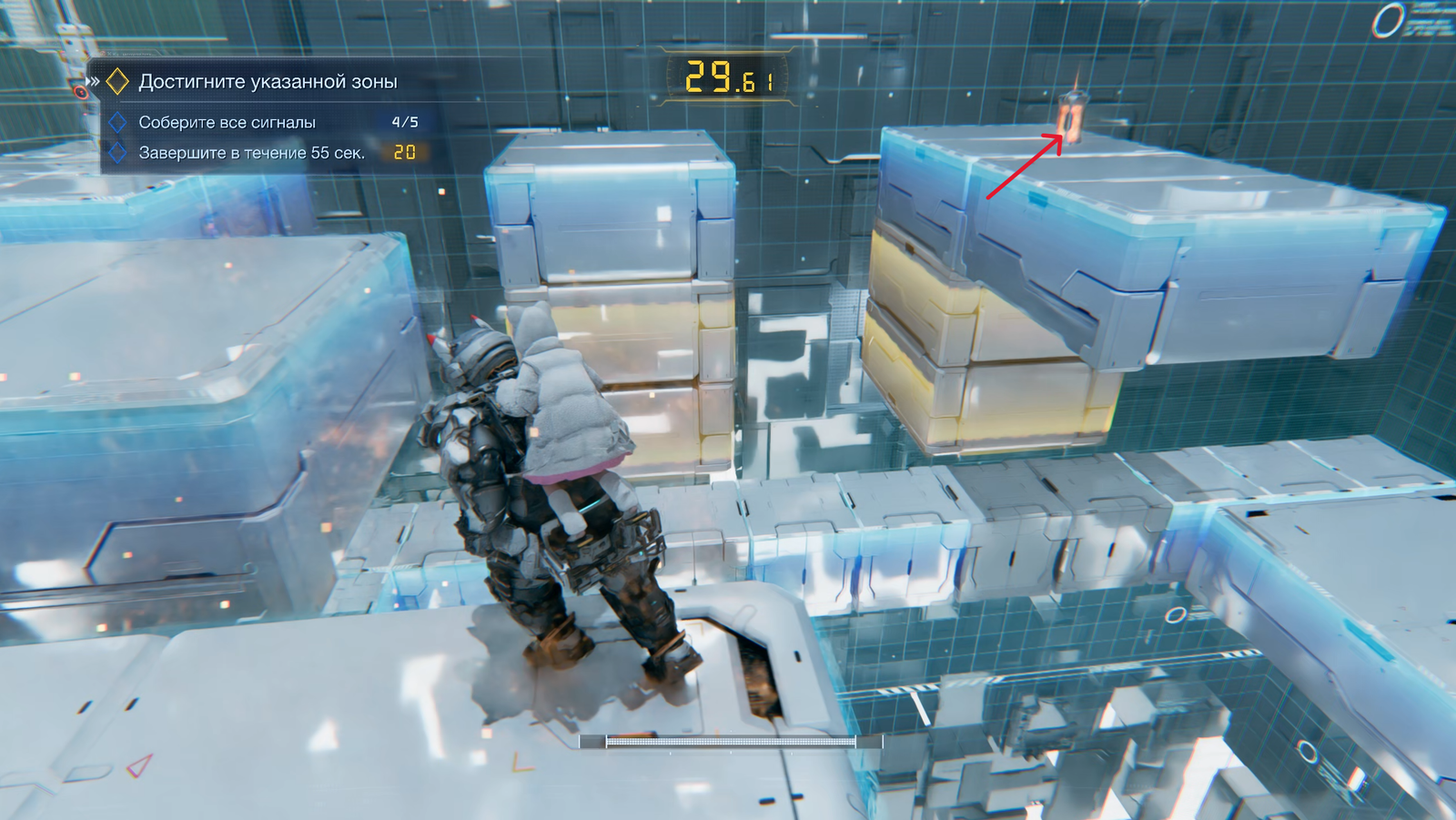 Перепрыгивайте пропасть рывком и забирайтесь по платформам выше. Следующий контейнер будет на движущемся блоке, и вам нужно подловить момент, когда блок с контейнером опустится, тут же выстрелить и нажать рывок, чтобы пролететь дальше и уложиться в один цикл движения блока. Следом вам нужно проскочить к подъёмнику мимо двух движущихся блоков, но, если вы не уничтожили контейнер на старте испытания, придётся подстрелить и его. Также с помощью рывка вы можете перелететь к подъёмнику по диагонали, что сэкономит немного времени.