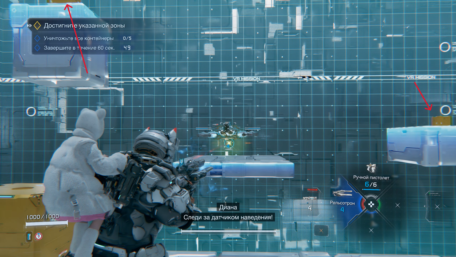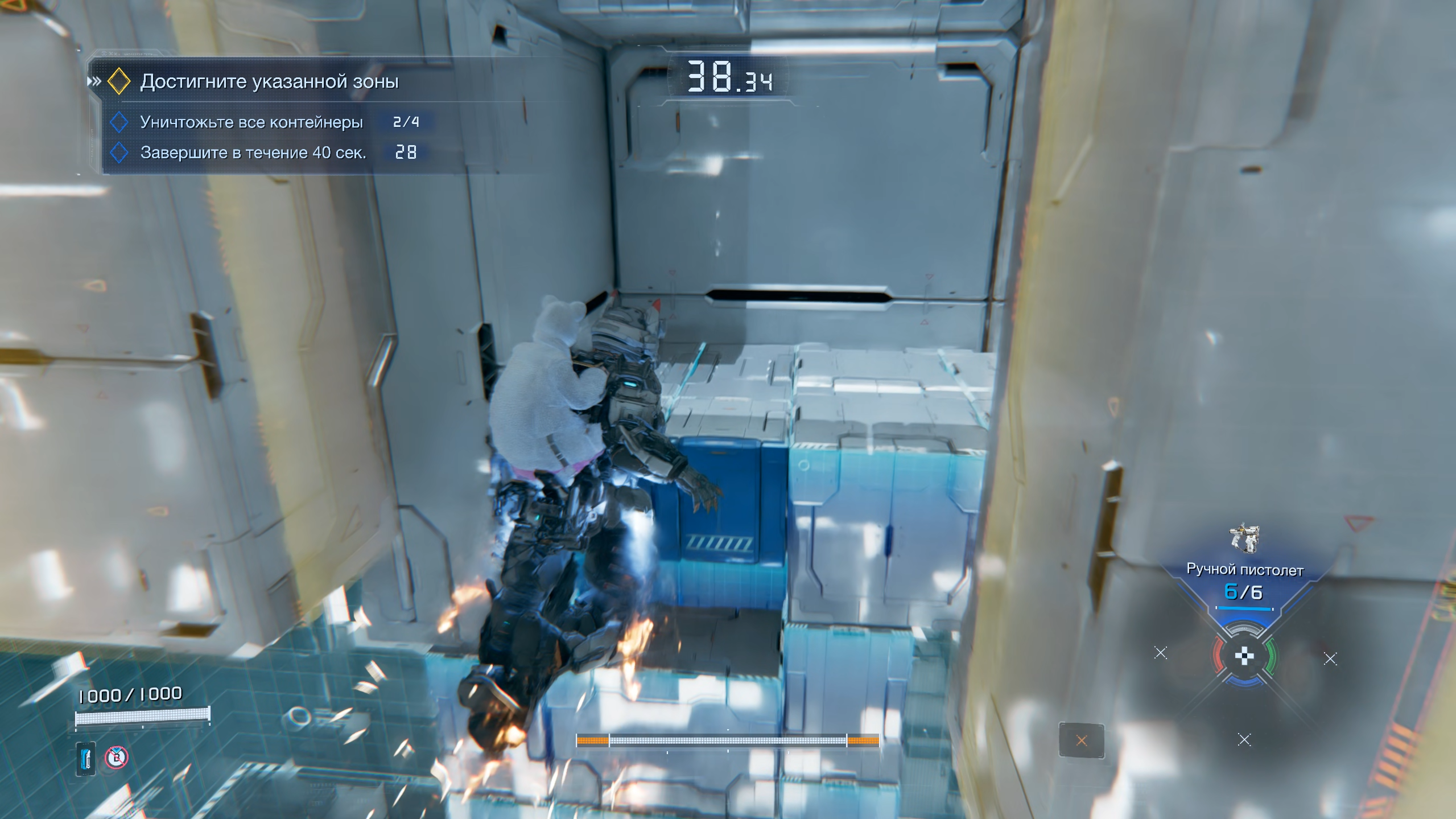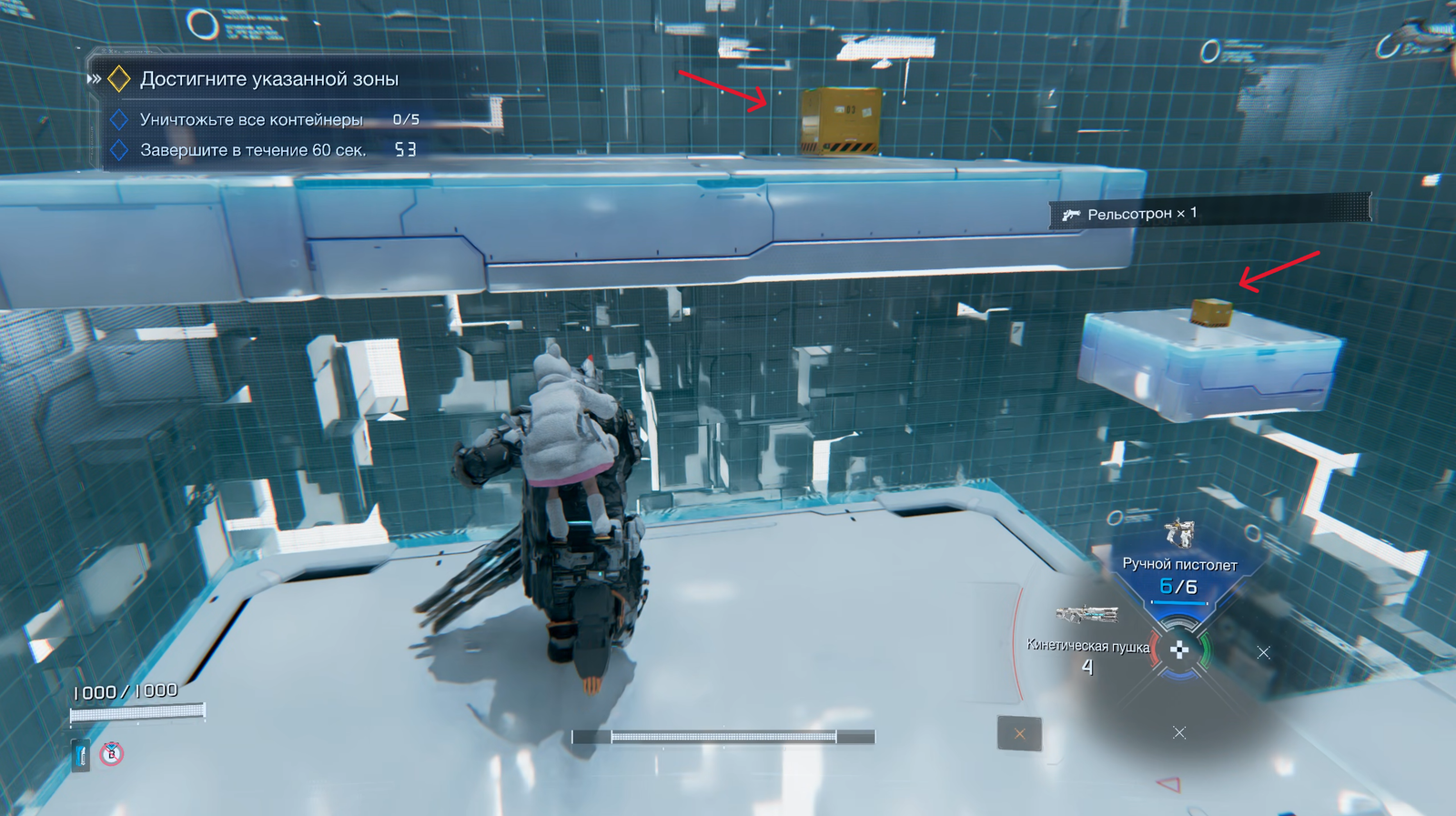 Сразу после старта прыгайте на первую движущуюся платформу, развернитесь и посмотрите вверх — подстрелите первый контейнер.