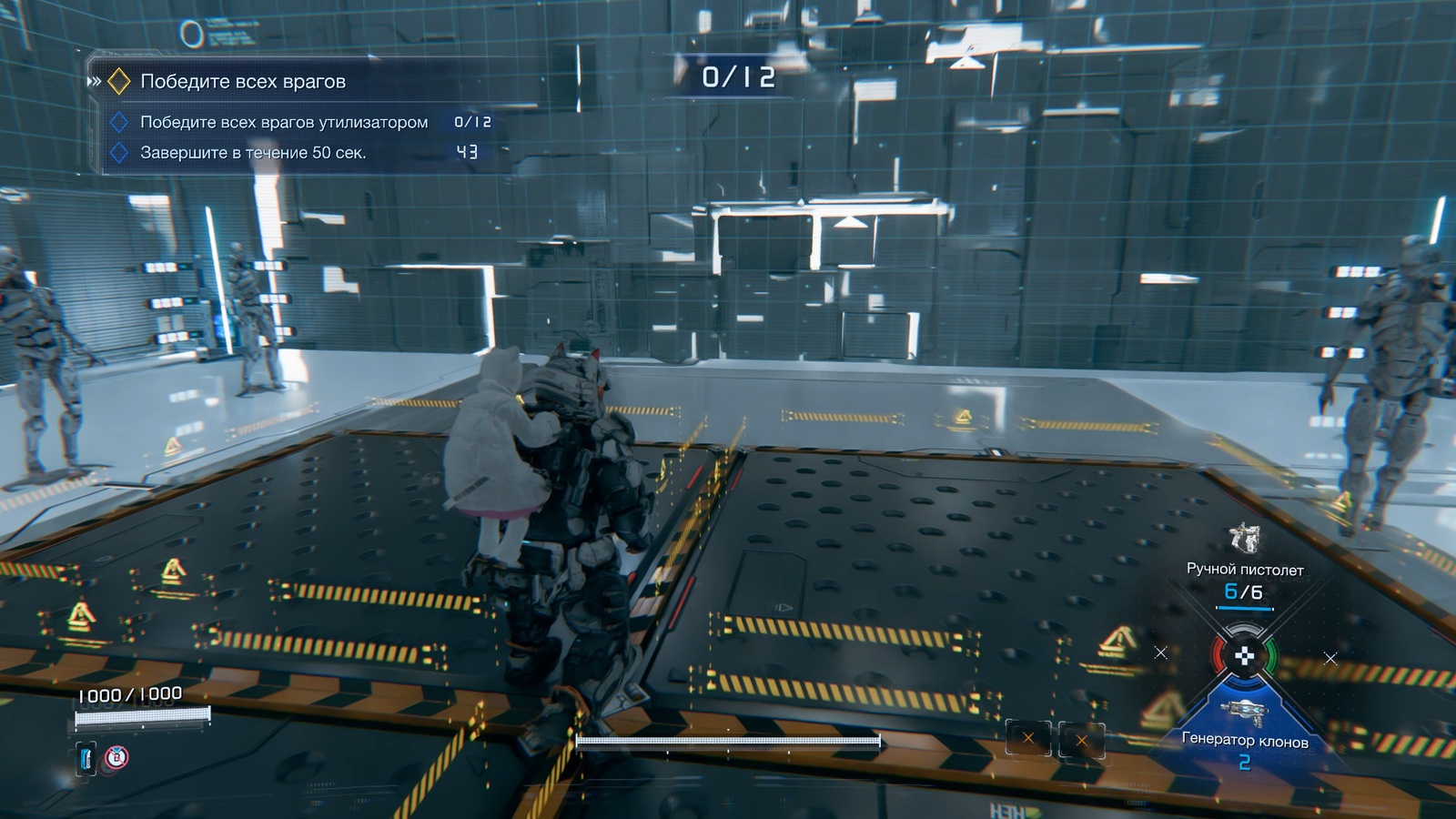 Сразу после начала подберите Генератор клонов, который лежит впереди, и встаньте в центр зоны поражения утилизатора. Ориентируйтесь по жёлтым предупреждающим меткам на полу.