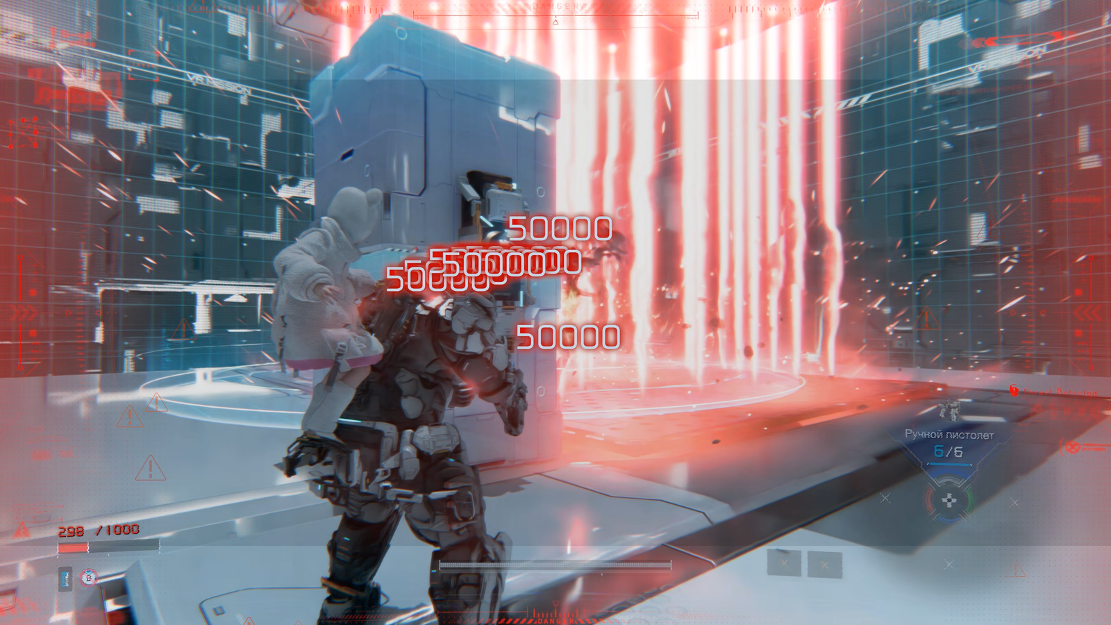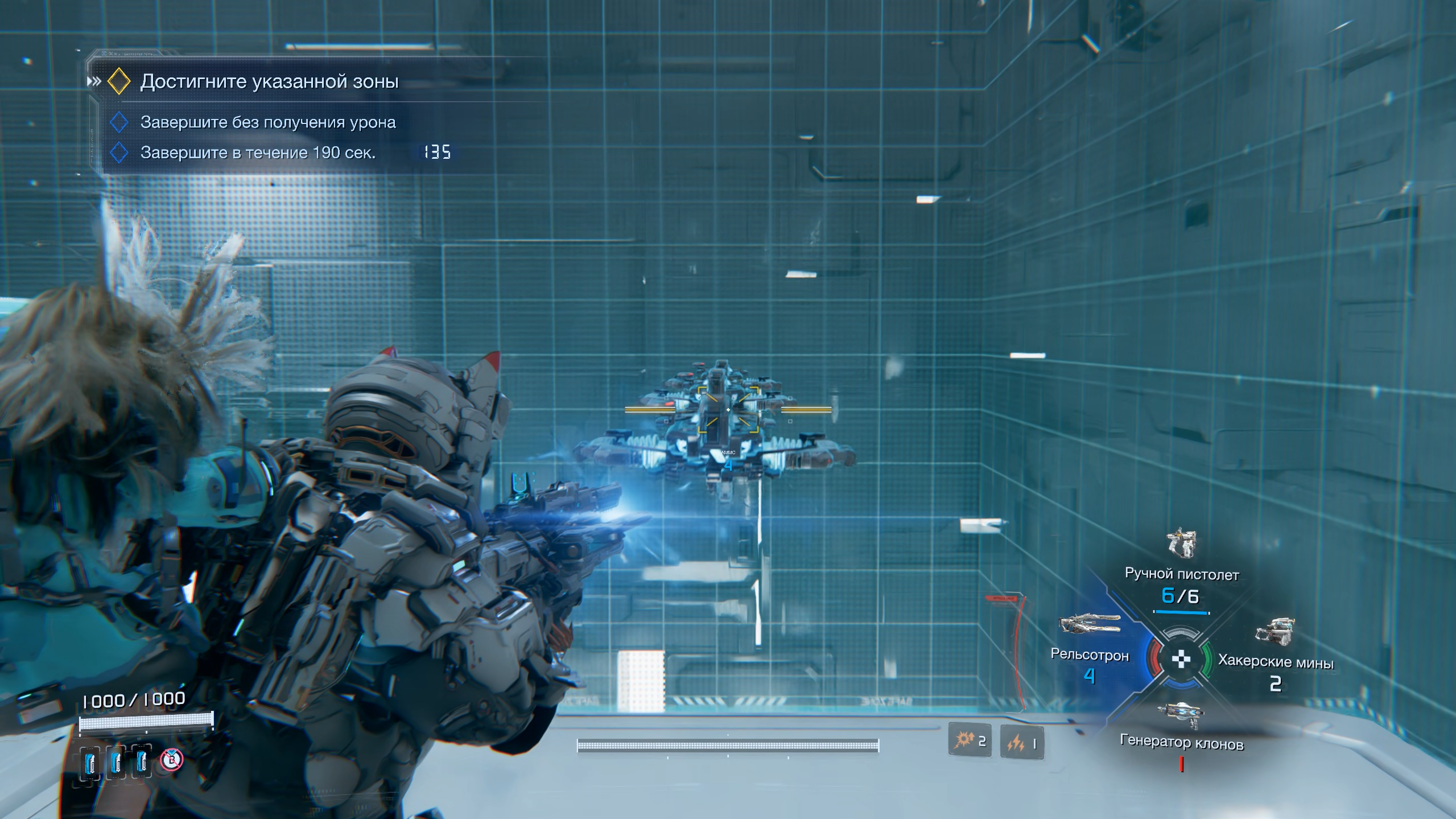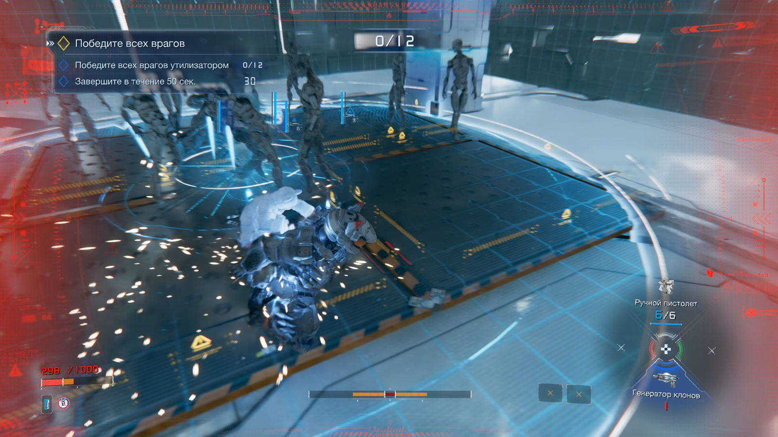 Следом будет зона с утилизатором и тремя противниками. Наша задача — как можно быстрее заманить их в утилизатор и испепелить. Для этого, как только подбежите к зоне утилизации, стреляйте из Генератора клонов в центр, а затем взломайте Обходчика MK-II и выстрелите по нему один раз из пистолета.