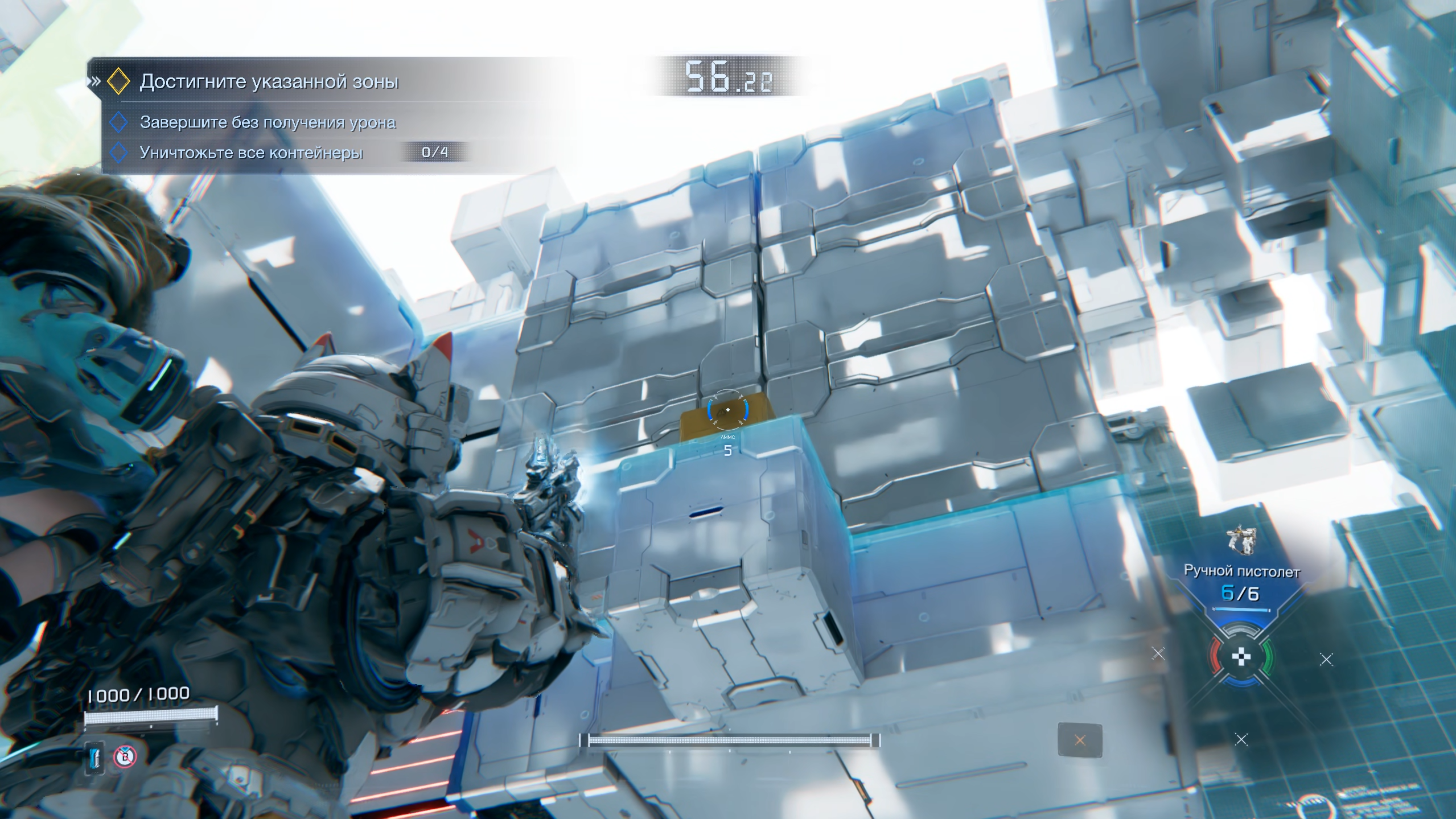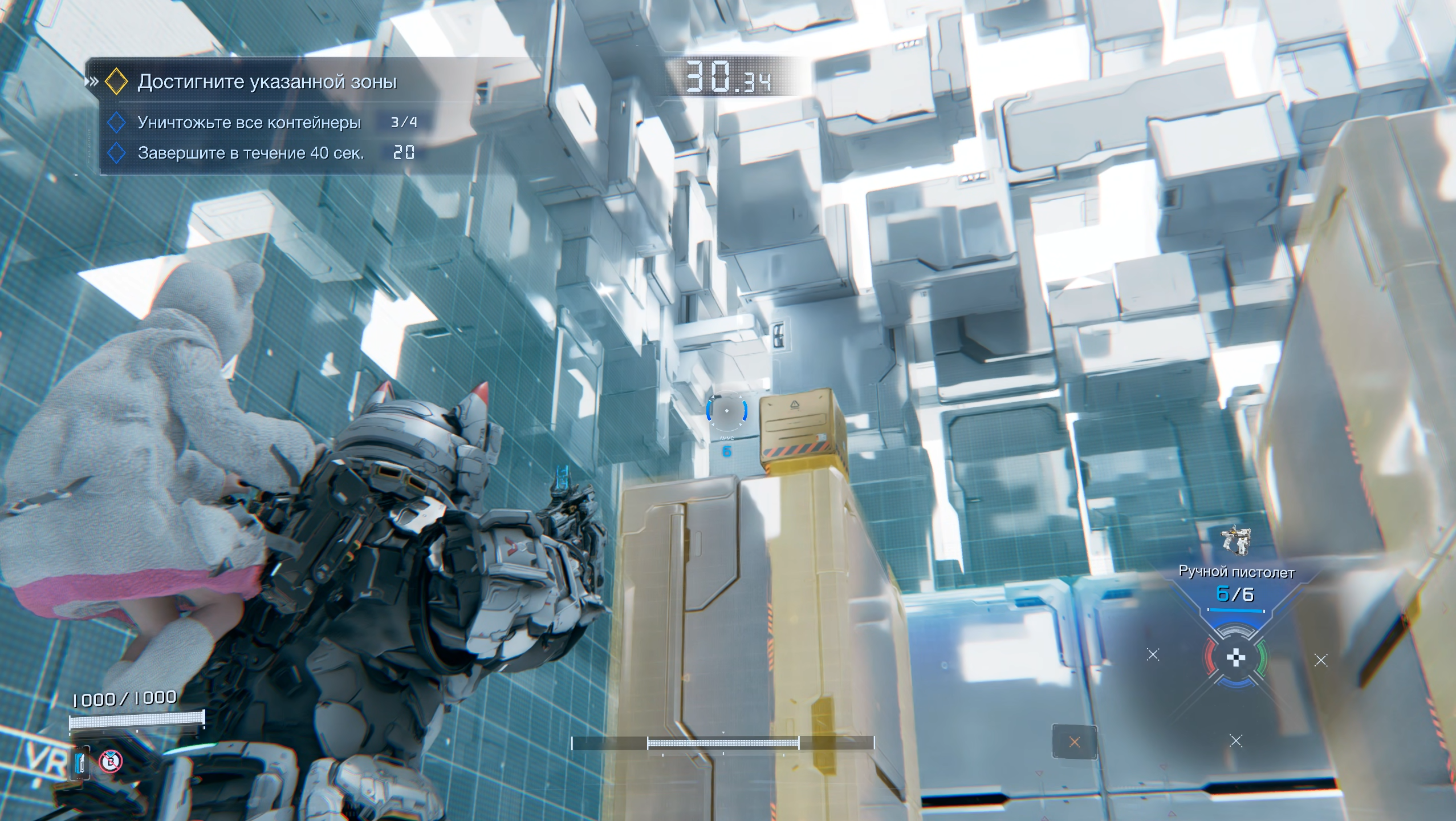 После начала прыгайте на движущуюся платформу справа, затем — на площадку слева и сразу стреляйте в первый контейнер. Дальше будут три движущиеся платформы. Быстро переберитесь на последнюю и выстрелите в контейнер впереди. Если удобнее, можно спрыгнуть на уступ справа и выстрелить оттуда. Затем пройдите ещё один участок с тремя платформами, поднимитесь наверх и по дороге к выходу уничтожьте два последних контейнера.
