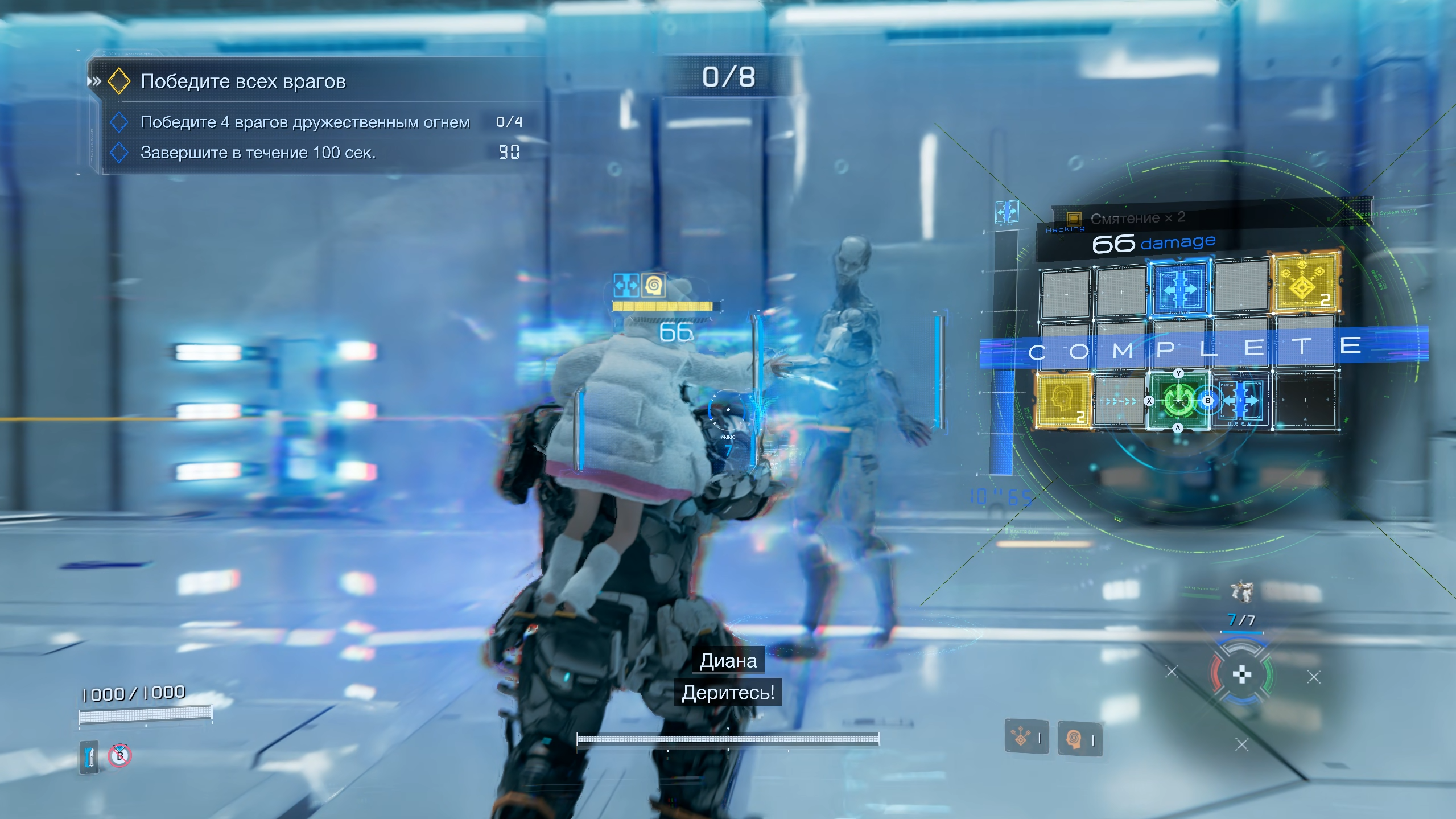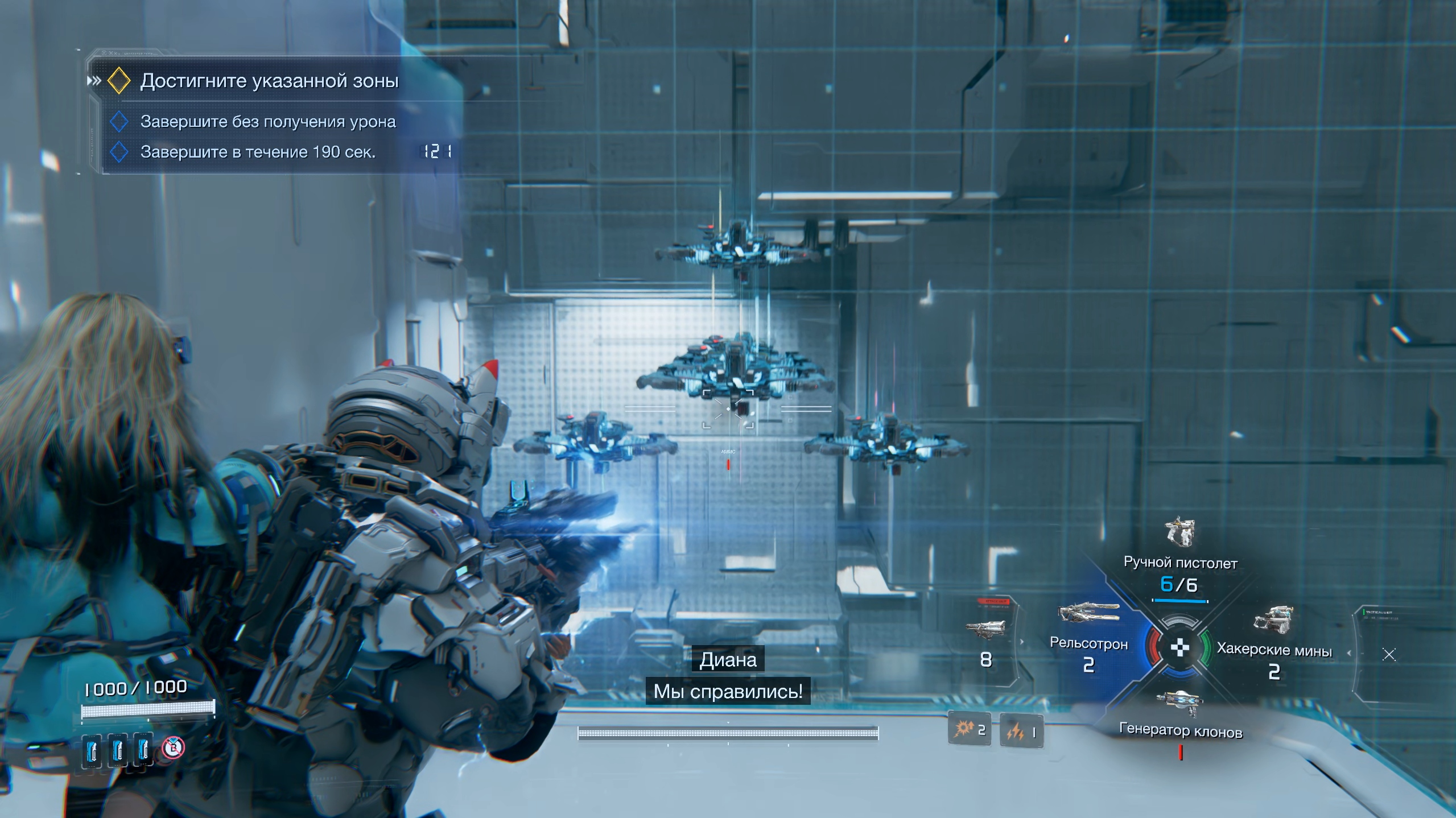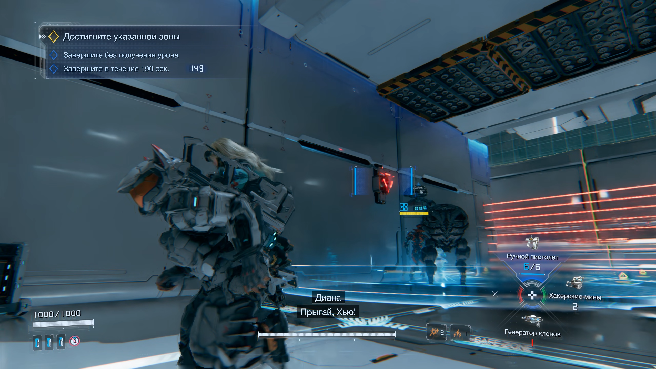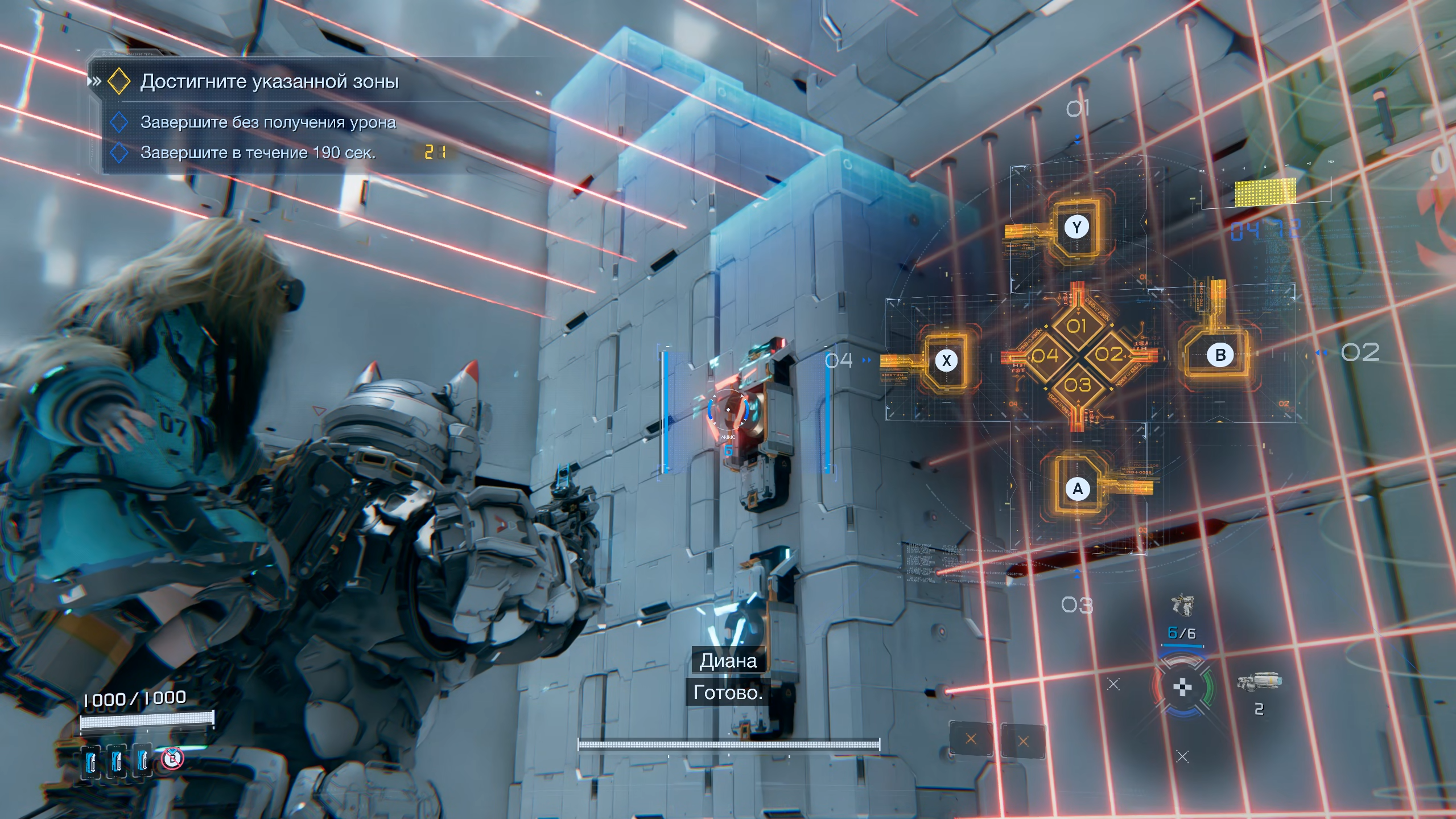 Теперь самое главное: в третьей волне в живых остаётся Ракетный Наблюдатель, чьи снаряды Диана может взламывать и отправлять обратно. Это вам и нужно сделать, причём так, чтобы возвращённая ракета добила противника. Сделать это очень просто: первую его ракету взломайте и отправьте обратно, затем взломайте самого Наблюдателя и сделайте пару выстрелов из пистолета.