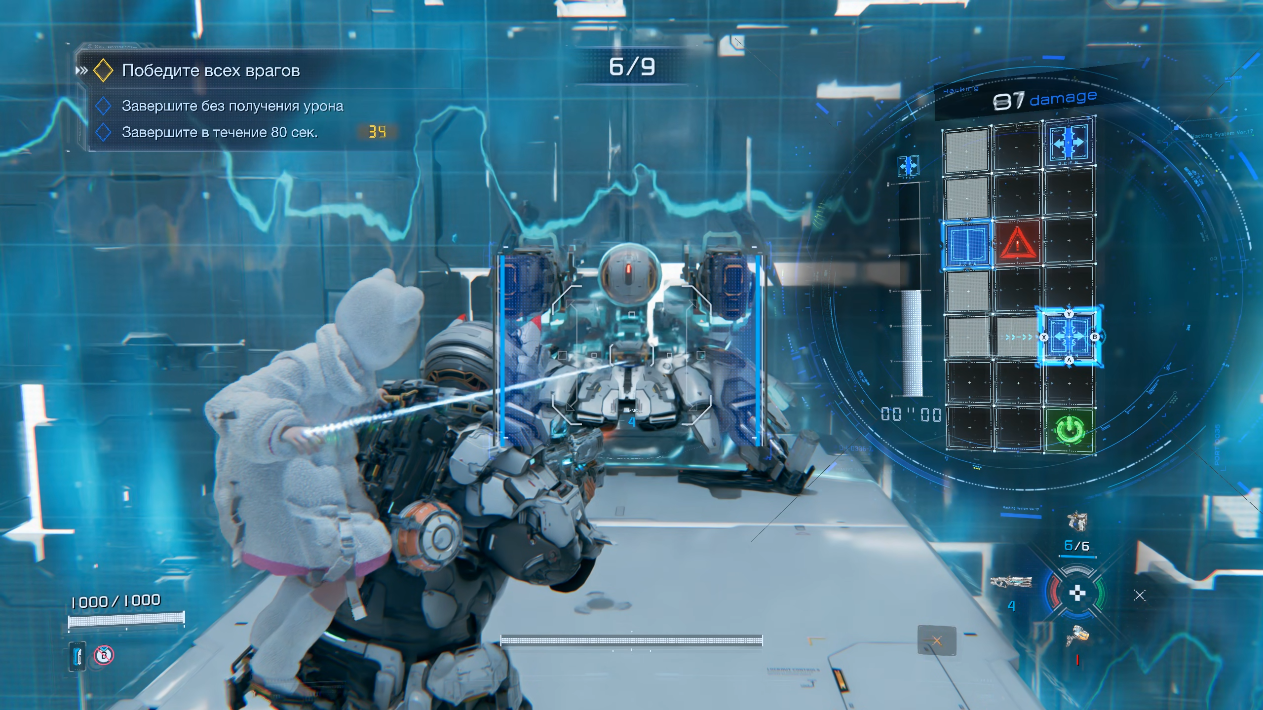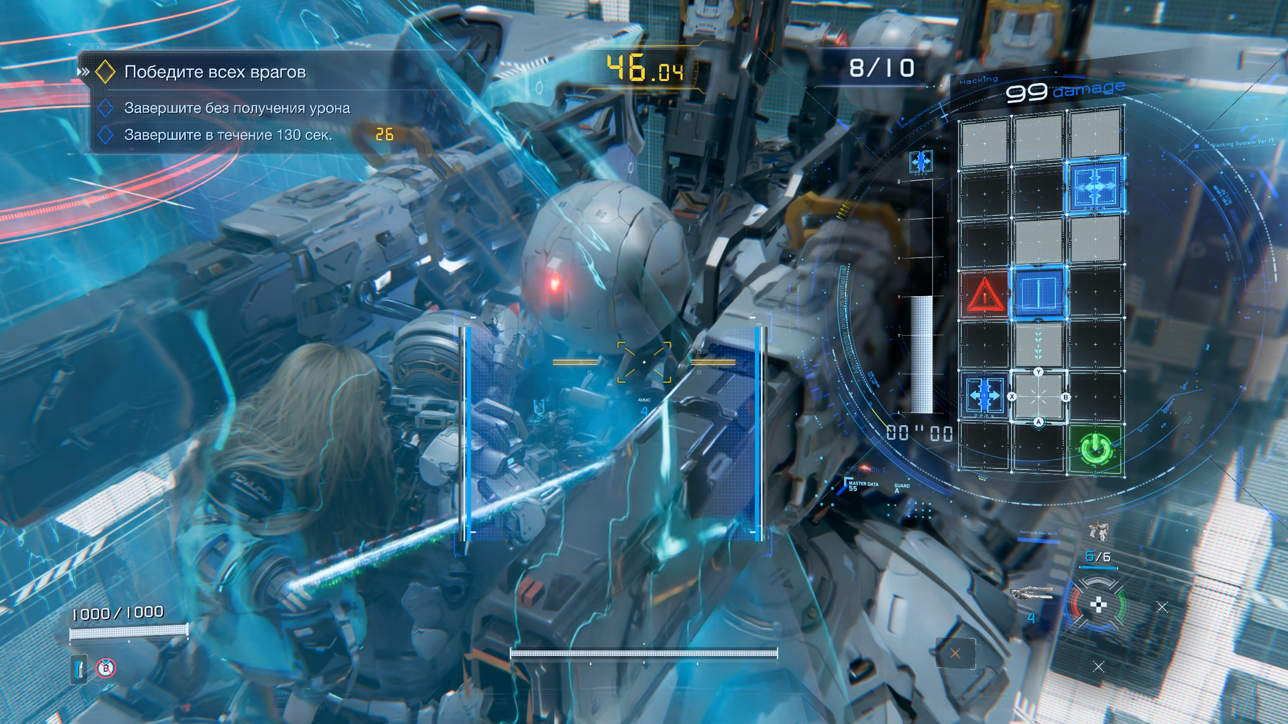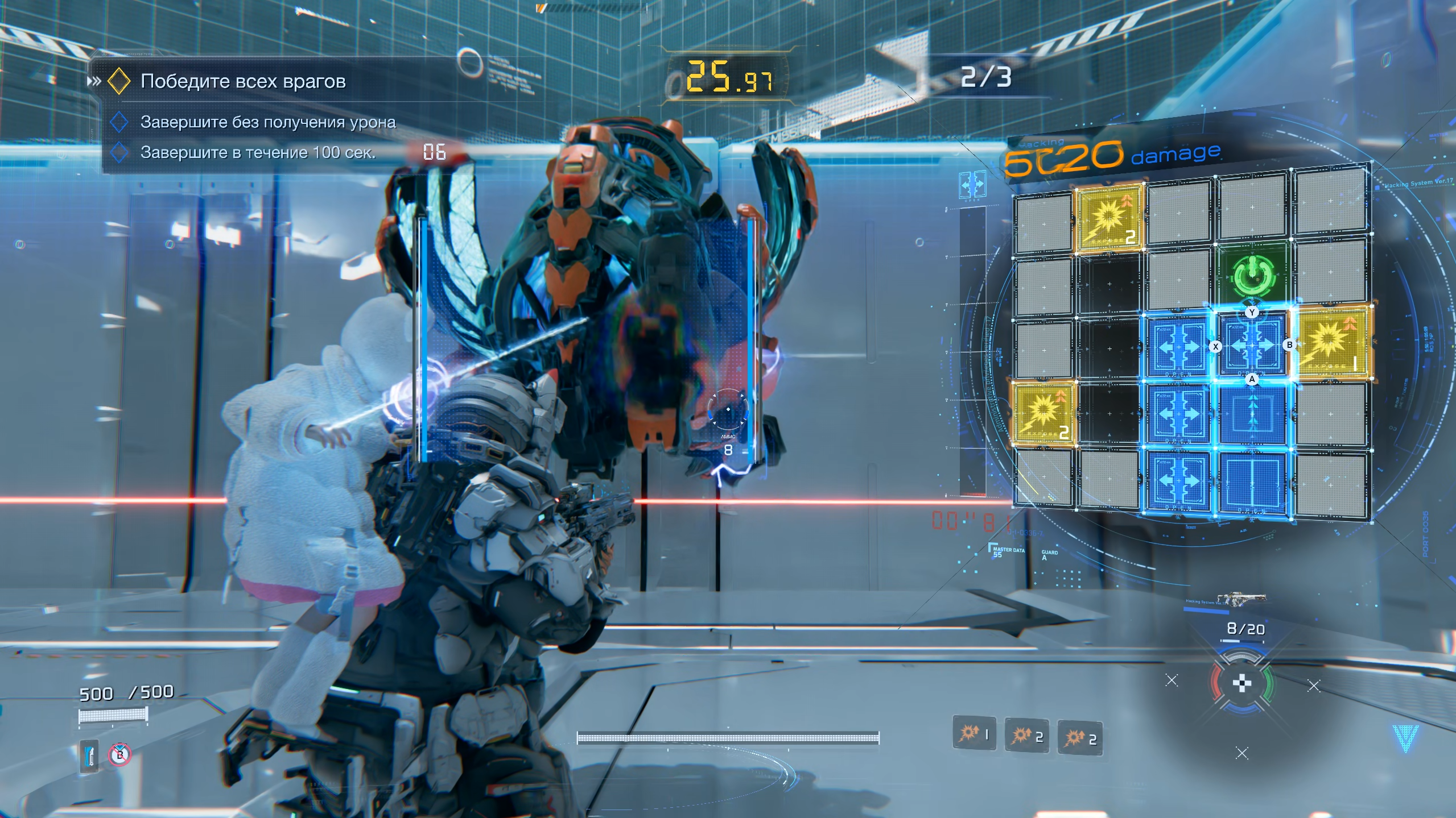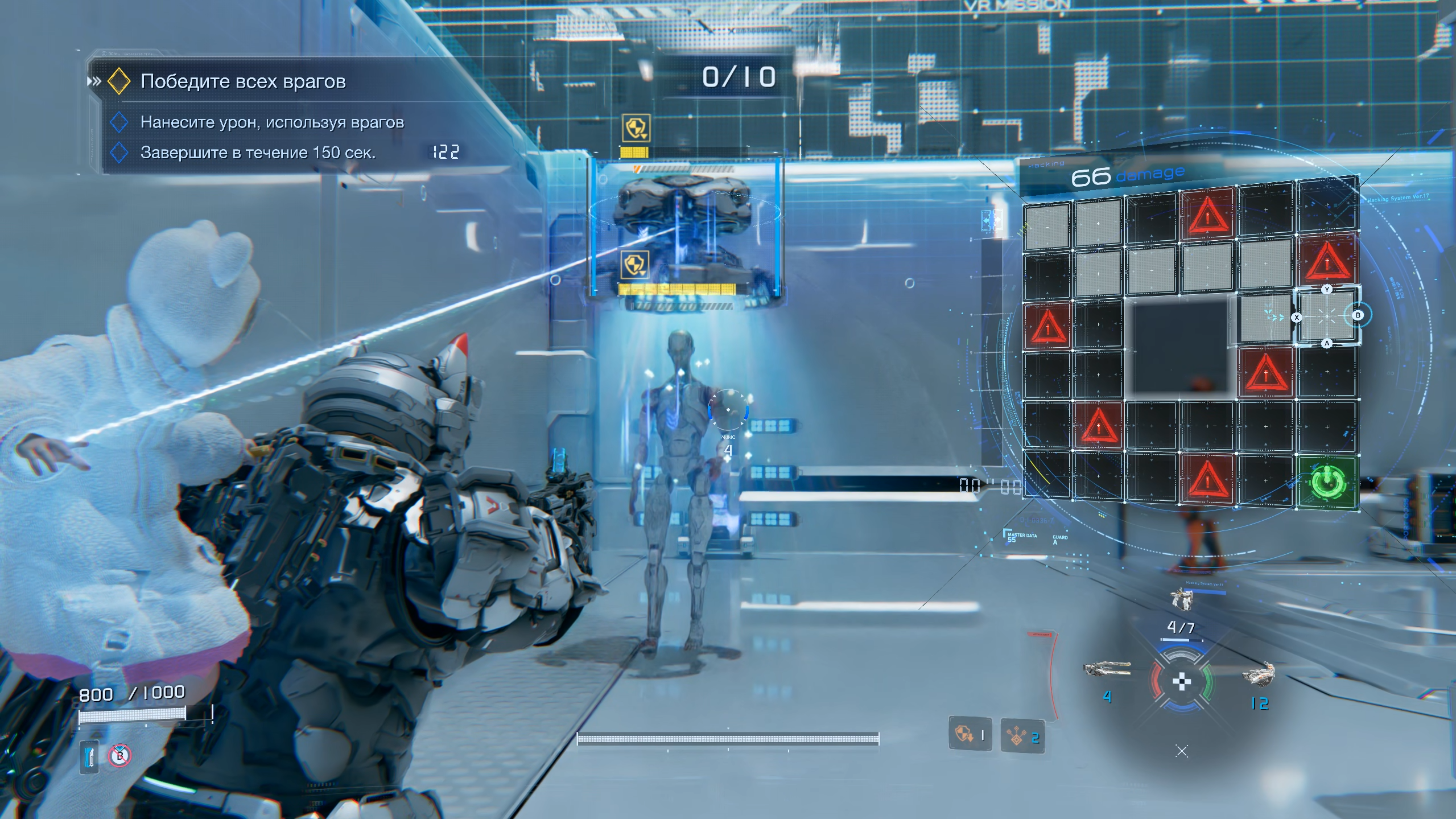 В этом испытании нужно по очереди уничтожить двух противников: Защитника и Бомбардировщика. По арене разбросаны Генераторы кода и узлы взлома «Уязвимость», и это ваше главное оружие. Генератор кода позволит не тратить время на уничтожение щита Защитника, а сразу взламывать его и накапливать перегрев для критического урона. Чем больше узлов «Уязвимости» вы пройдёте за один раз, тем сильнее заполнится шкала критического удара. Главное — не добить противников раньше времени. В остальном проблем возникнуть не должно.
