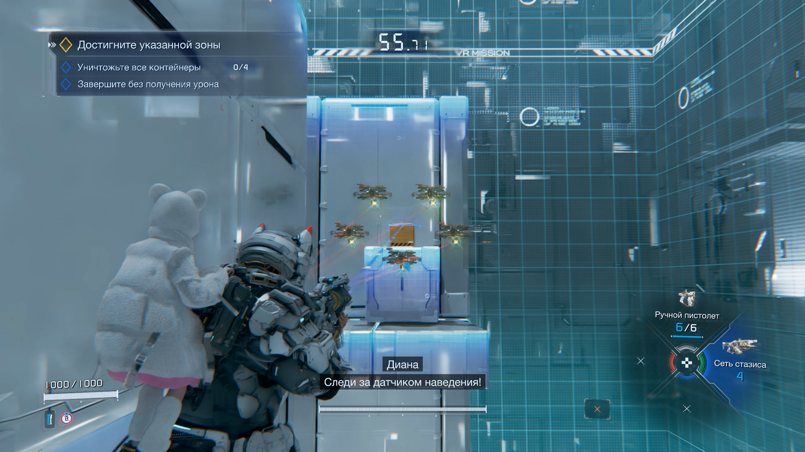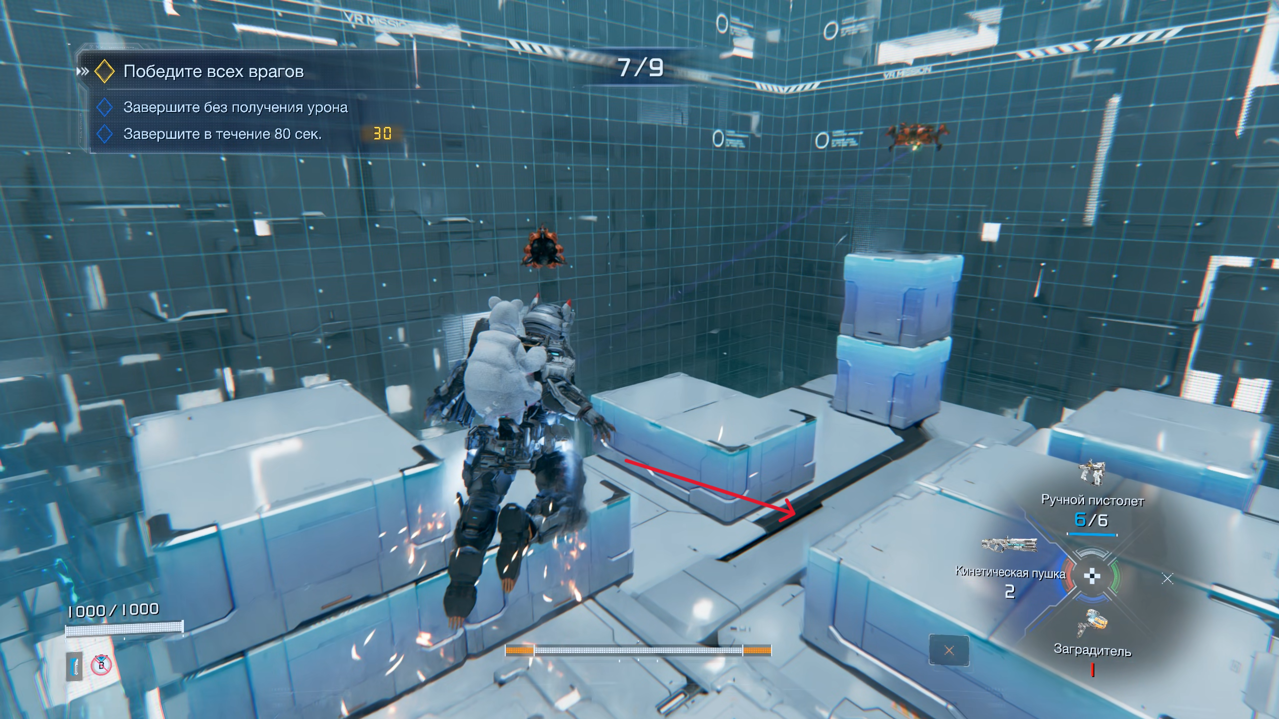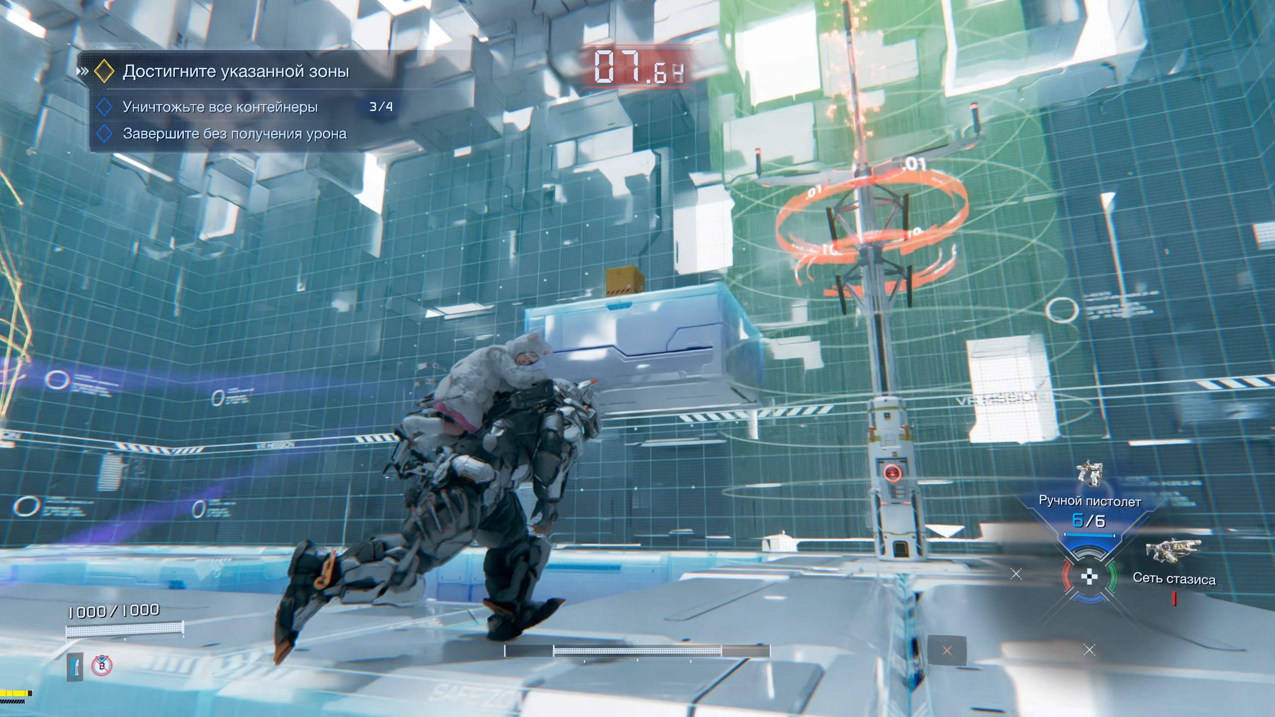 Это достаточно сложное испытание, но, следуя инструкции, его можно завершить без лишней головной боли. Сразу после старта подберите «Сеть стазиса», прыгайте на платформу впереди и стреляйте в контейнер перед собой — так вы не только разрушите его, но и прекратите атаку Наблюдателей.