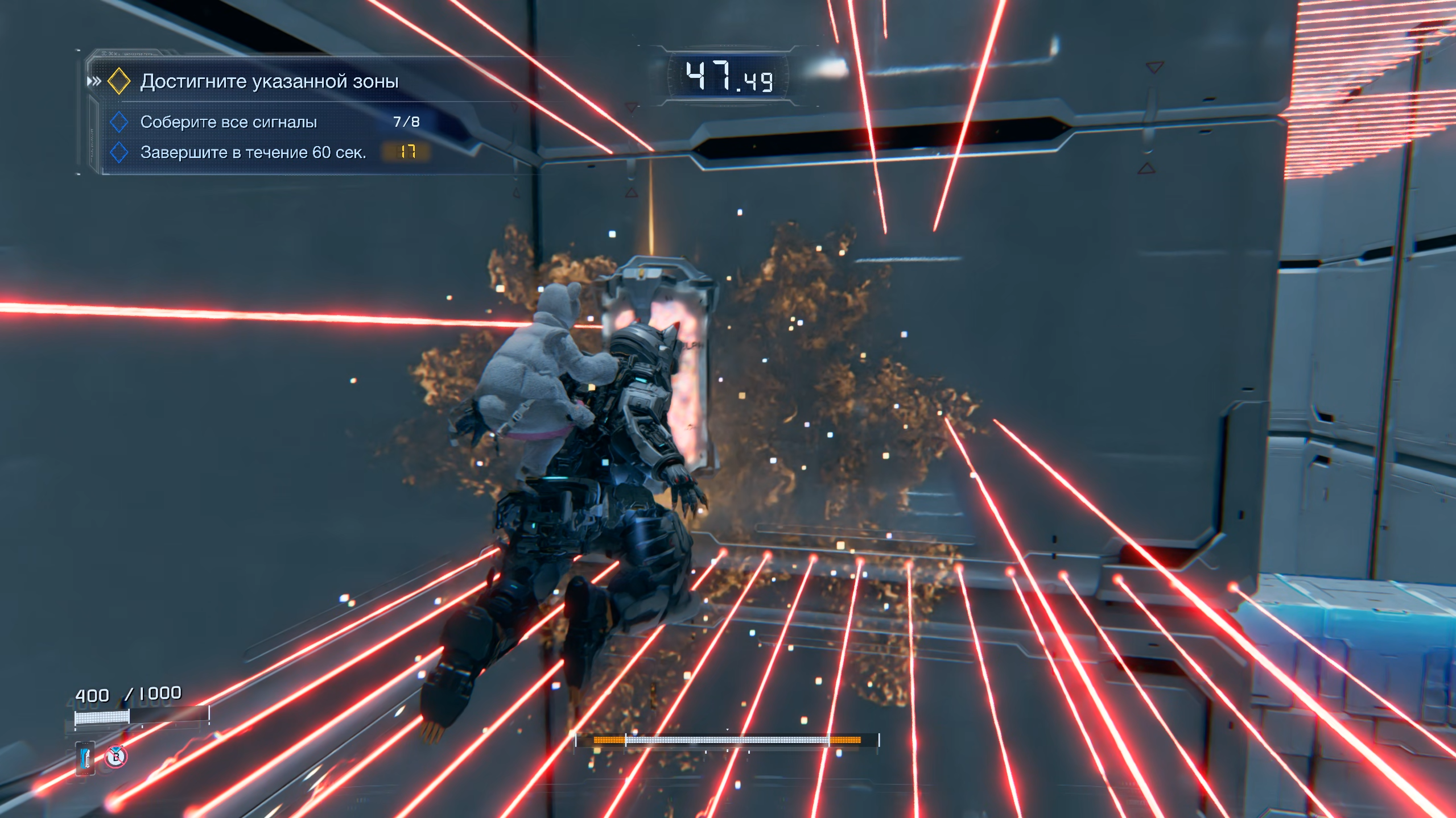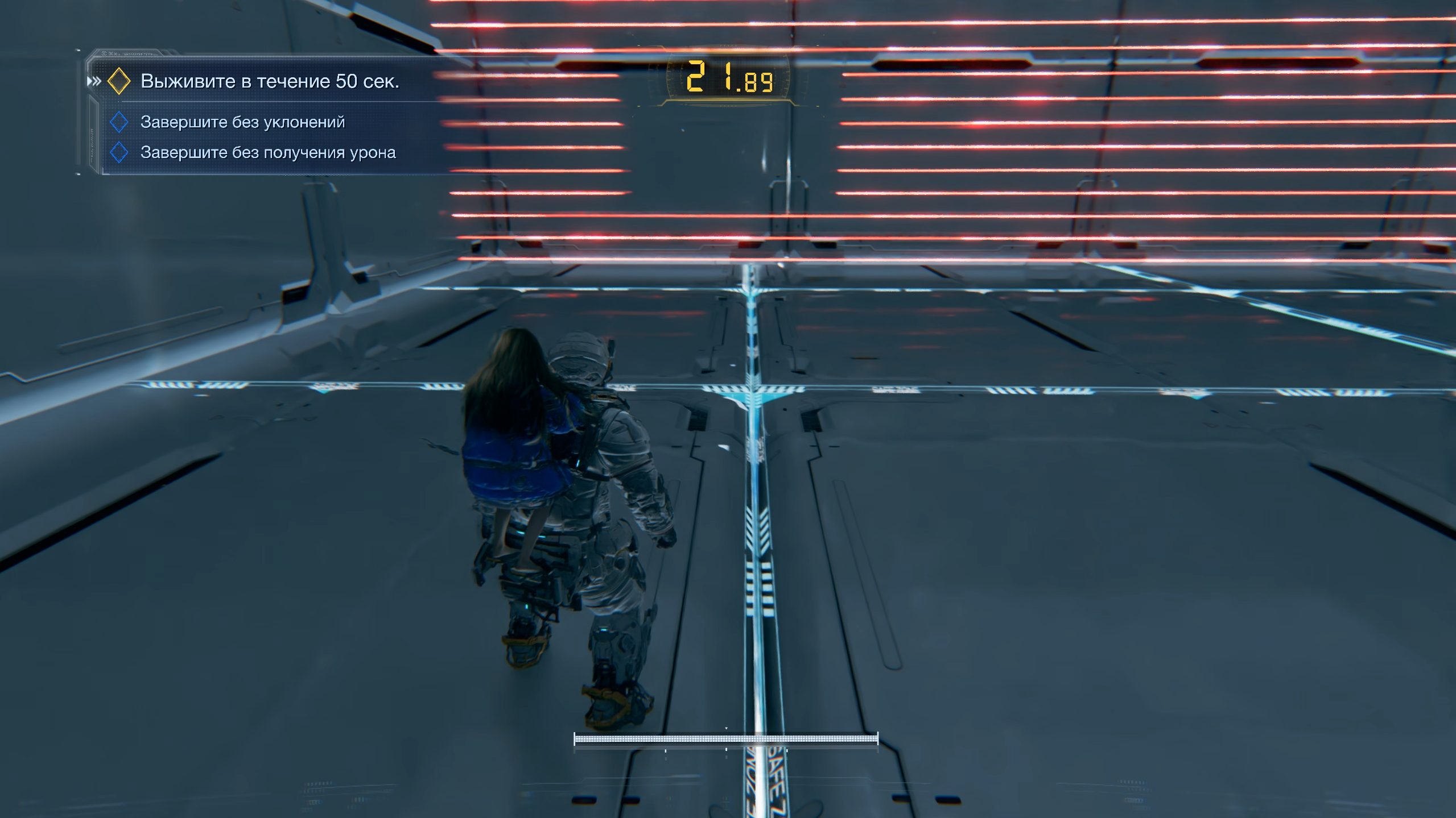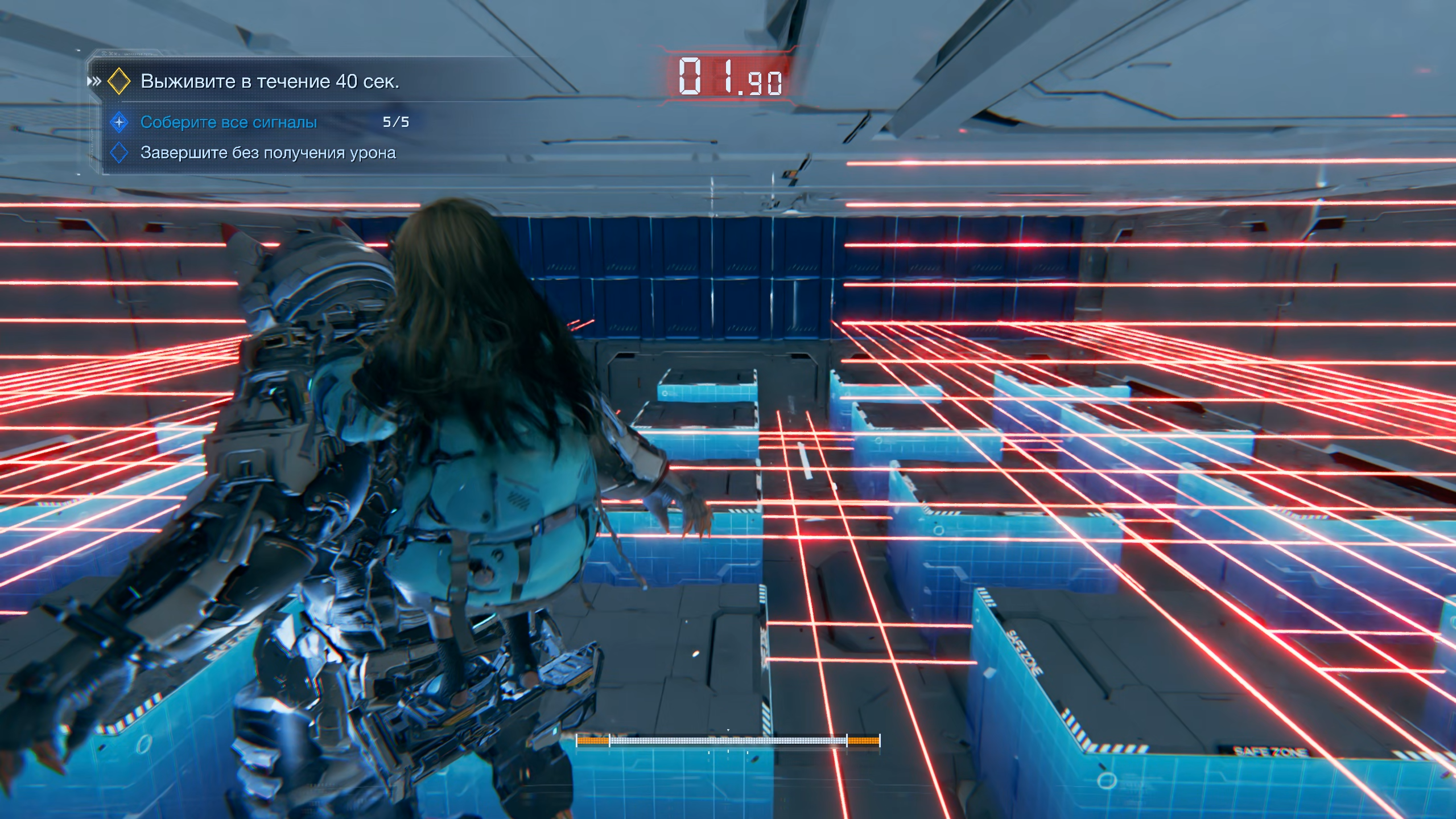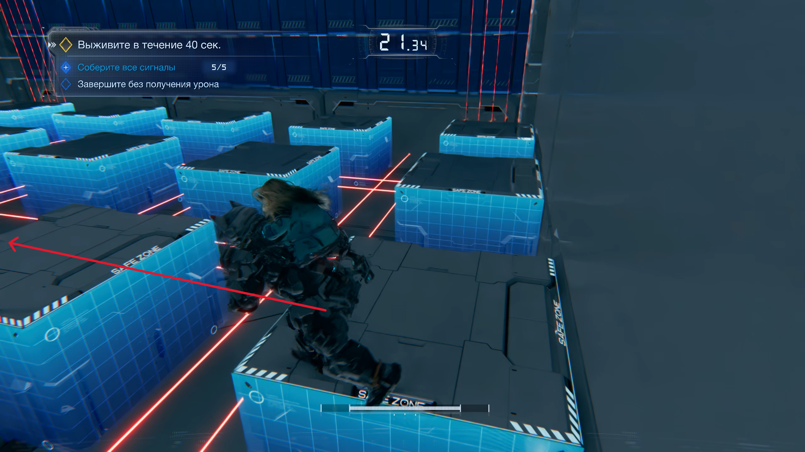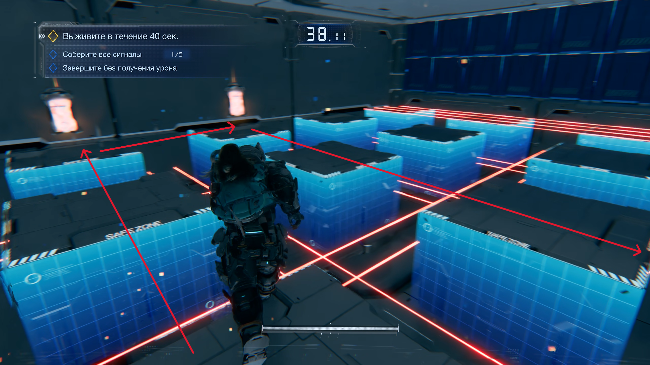 В этом испытании нужно быстро добраться до финиша, проходя через участки с лазерами и собирая сигналы. Никакого условия по получению урона нет. Постоянно используйте рывок, чтобы сократить дистанцию, и не бойтесь того, что можете случайно пару раз получить урон от лазера — достаточно просто не умереть.