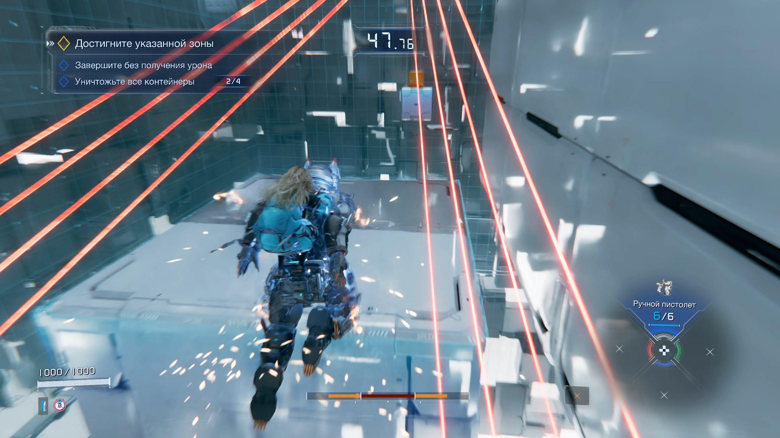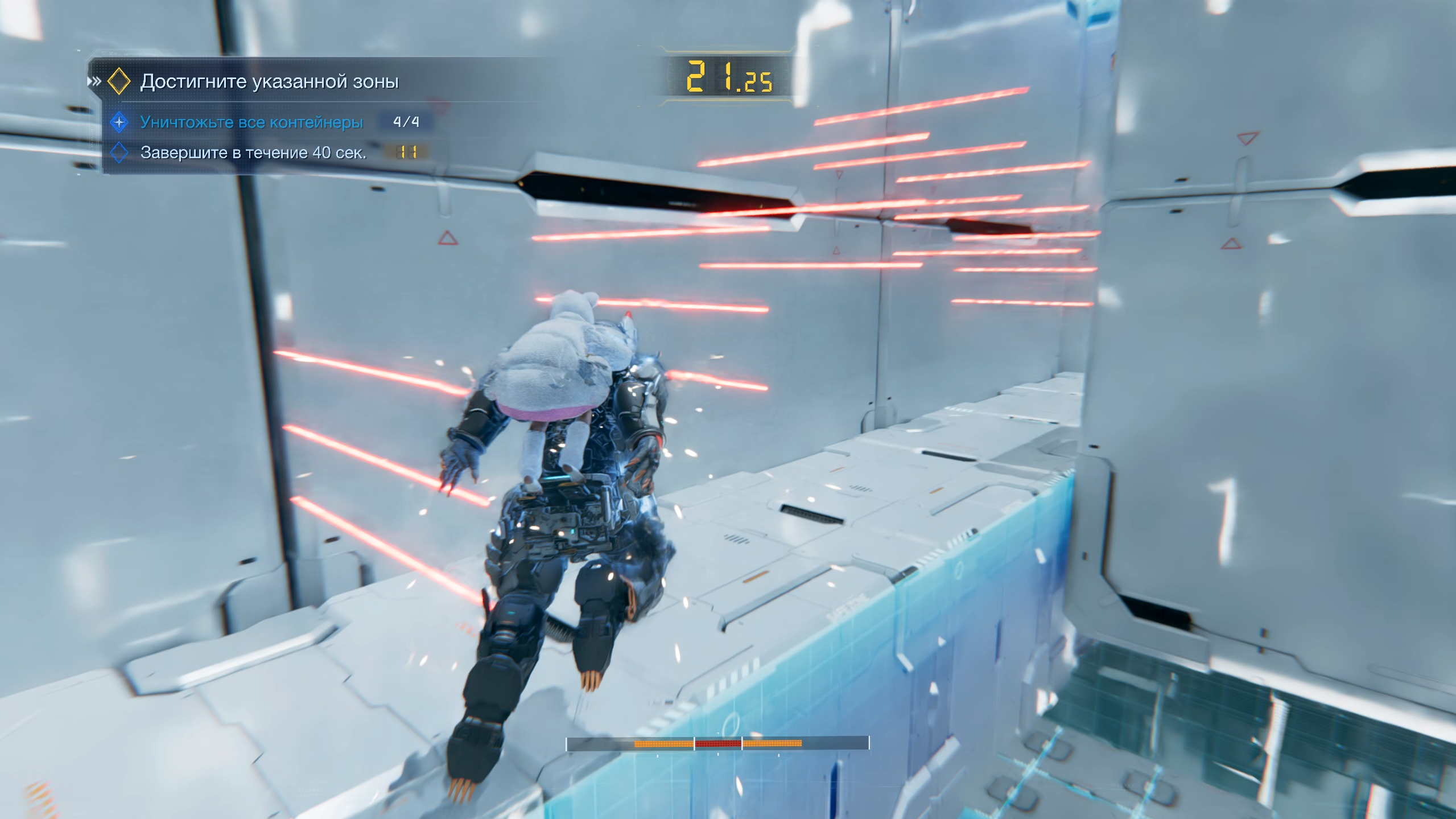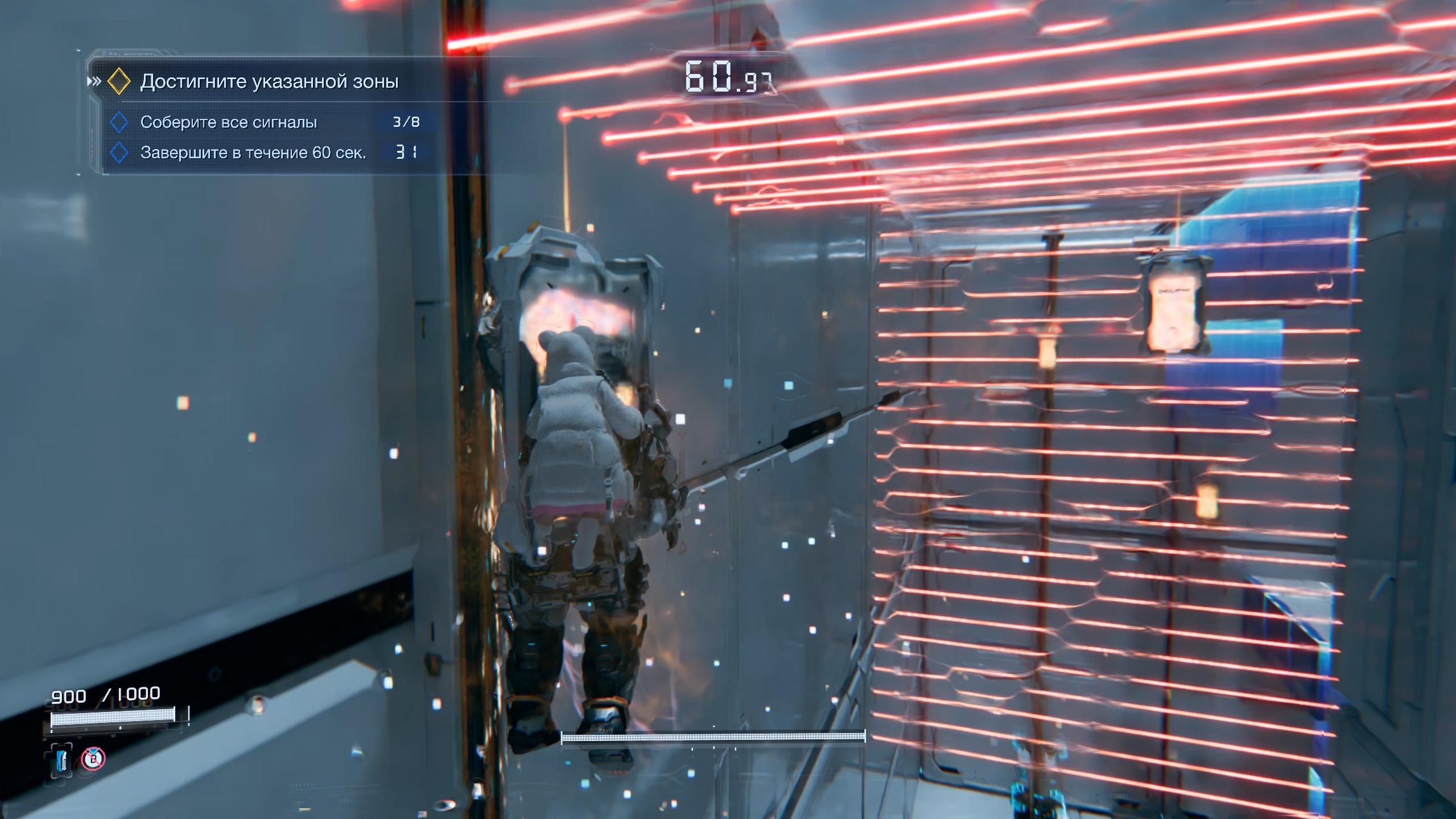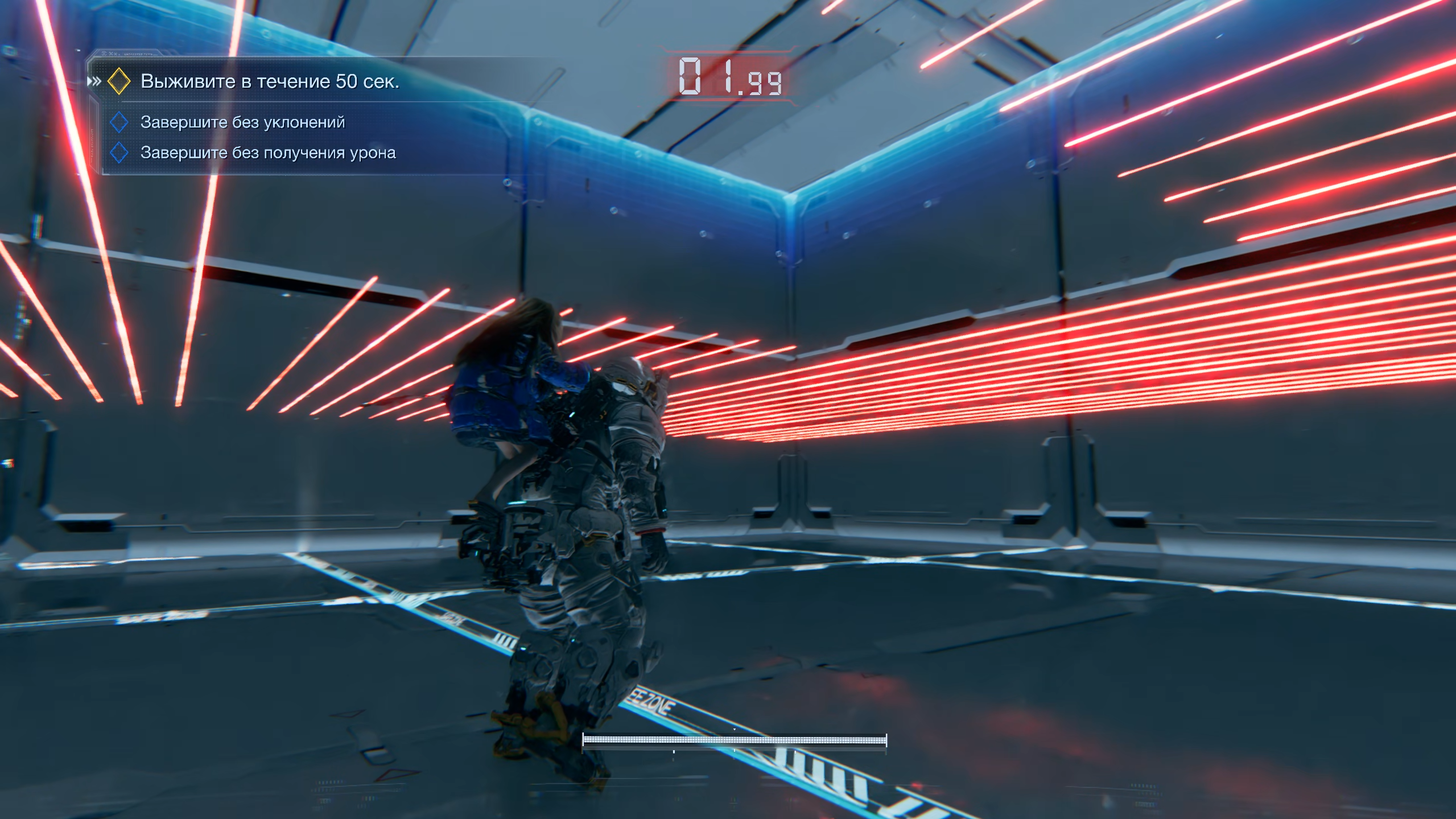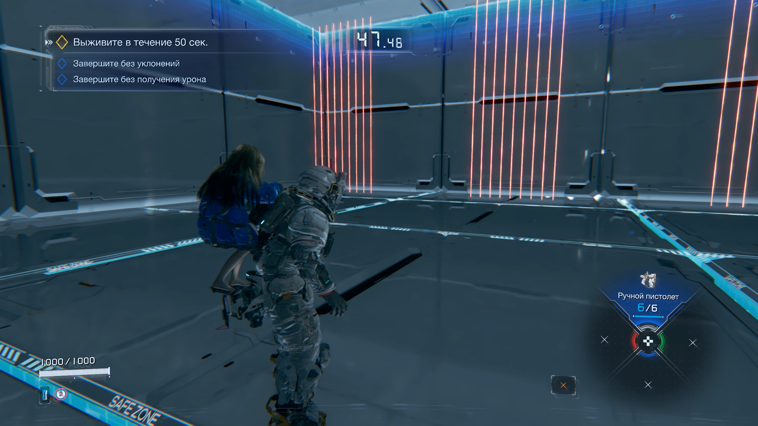 В этом испытании нужно быстро добраться до финиша, проходя через участки с лазерами и собирая сигналы. Никакого условия по получению урона нет. Постоянно используйте рывок, чтобы сократить дистанцию, и не бойтесь того, что можете случайно пару раз получить урон от лазера — достаточно просто не умереть.