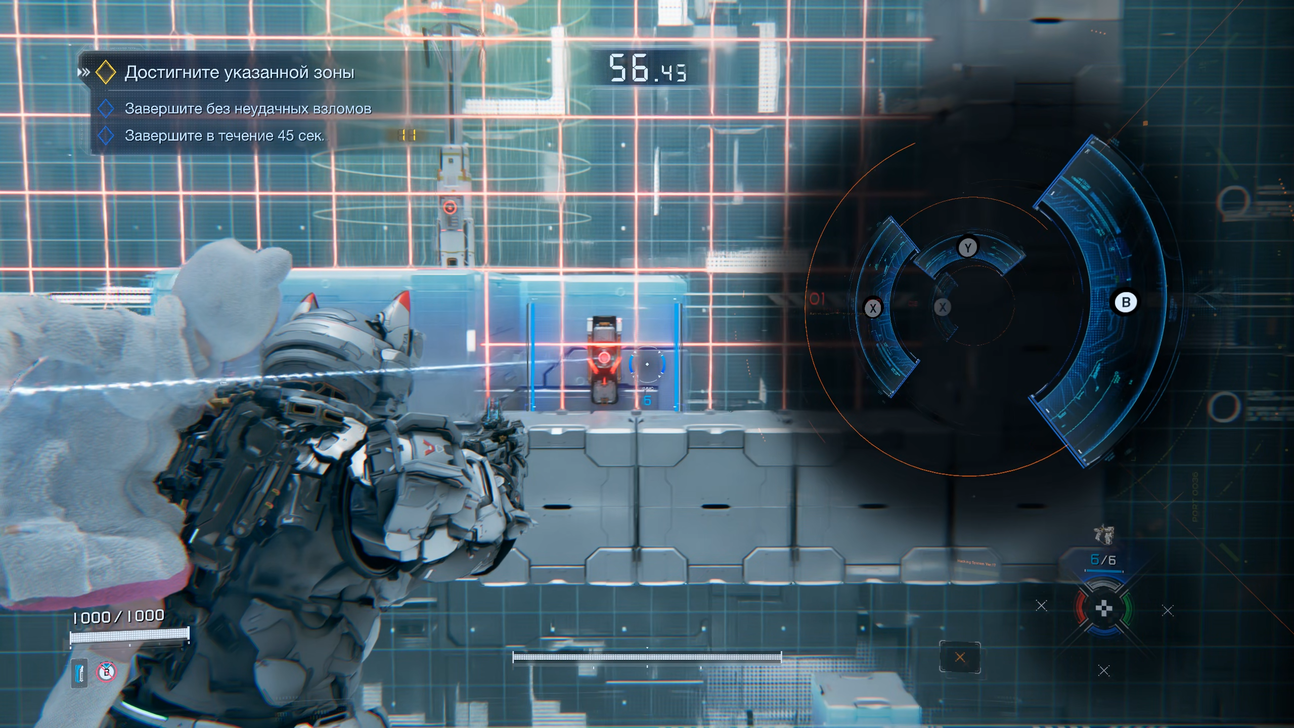 Как только вы подойдёте к ним, активируется лазерная сетка, которая начнёт спускаться с потолка, и, если не взломать четыре терминала примерно за 14 секунд, вы получите урон и провалите дополнительную цель. Сетка опускается всегда одинаково, независимо от того, сколько времени осталось в запасе, поэтому здесь стоит полагаться исключительно на ловкость пальцев. После взлома терминалов лазеры отключатся, и останется только активировать финиш.