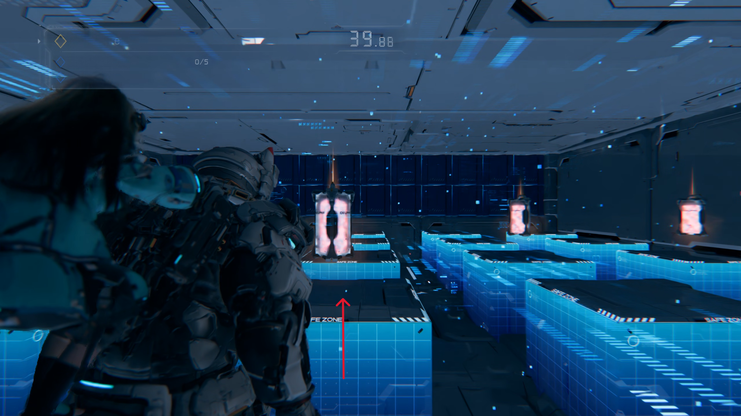 Примерно за 8 секунд до конца сверху появится ещё одна большая лазерная решётка и начнёт опускаться вниз. А с противоположного конца арены будет двигаться горизонтальная решётка с узким окном безопасности. Это легко пережить, если в этот момент просто находиться в стартовой точке и подпрыгнуть навстречу горизонтальной решётке. Соответственно, нам нужно не просто обойти зону, чтобы собрать сигналы и выжить, но и вернуться назад. То есть двигаться лучше по часовой или против часовой стрелки в пределах первых трёх рядов.