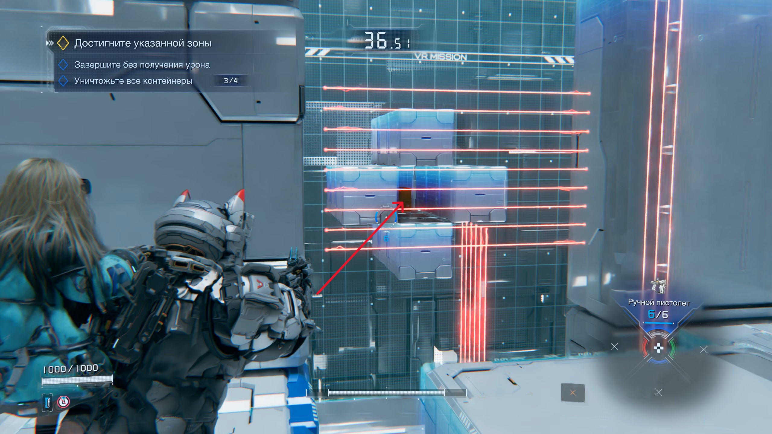 Сразу же повернитесь в сторону следующей платформы слева и подстрелите контейнер чуть правее до того, как следующая движущаяся платформа приблизится. После выстрела сразу жмите рывок и переходите на следующую платформу. Вы также можете подстрелить второй контейнер со второй платформы, но, мне кажется, это более рискованно, поскольку нужно ещё обогнуть лазеры по пути.