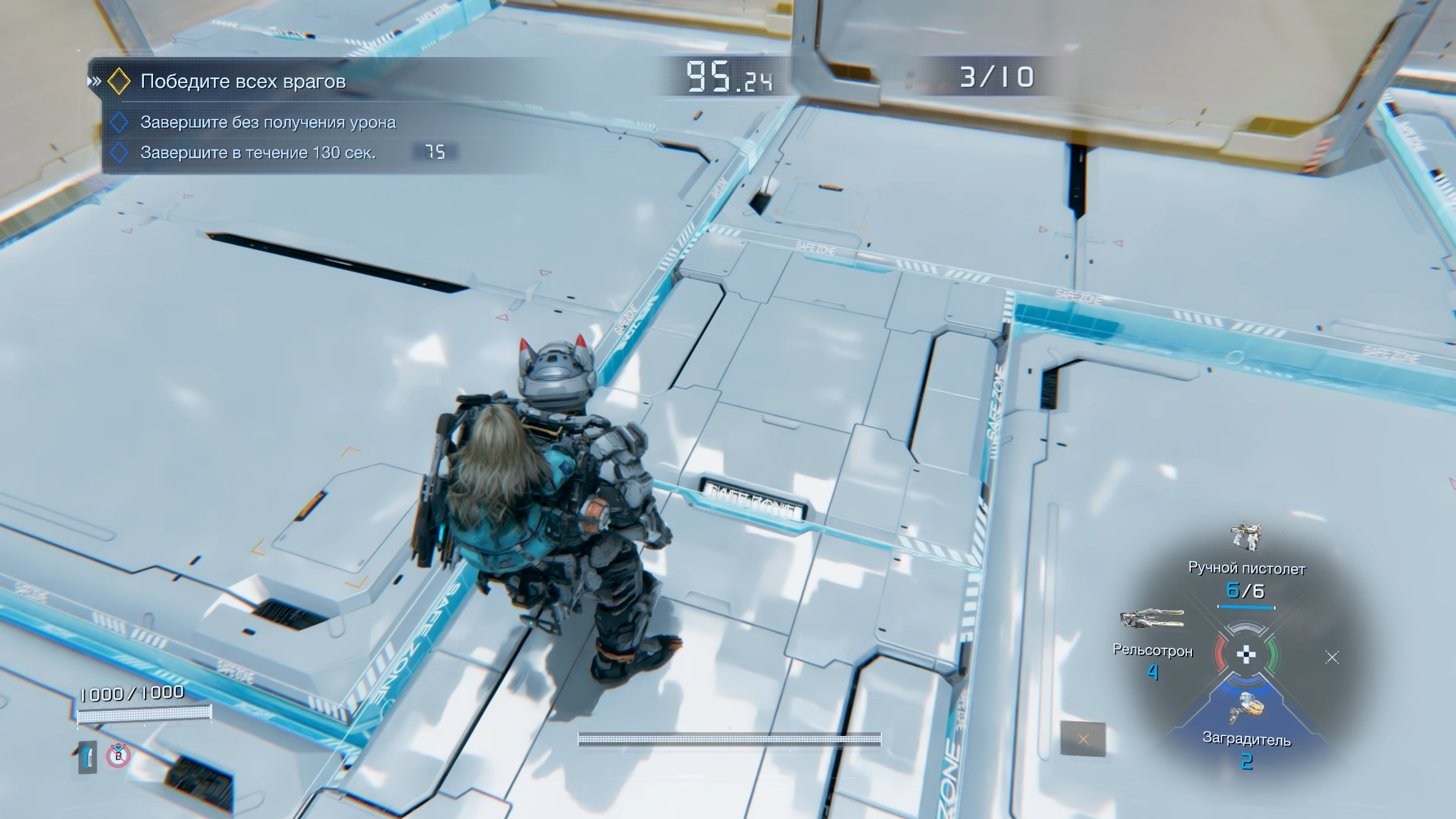 После того как вы уничтожите одного Ракетного Наблюдателя, а второй будет близок к смерти, — допустим, вы уже взломали ракету, которая его наверняка добьёт, но она ещё не долетела, — стреляйте себе под ноги Заградителем и встречайте Стрелков. Они оба появятся прямо в центре безопасной зоны, там же, где и вы, — и вы сможете уничтожить их почти мгновенно выстрелом в упор из Рельсотрона. На этом испытание завершится.