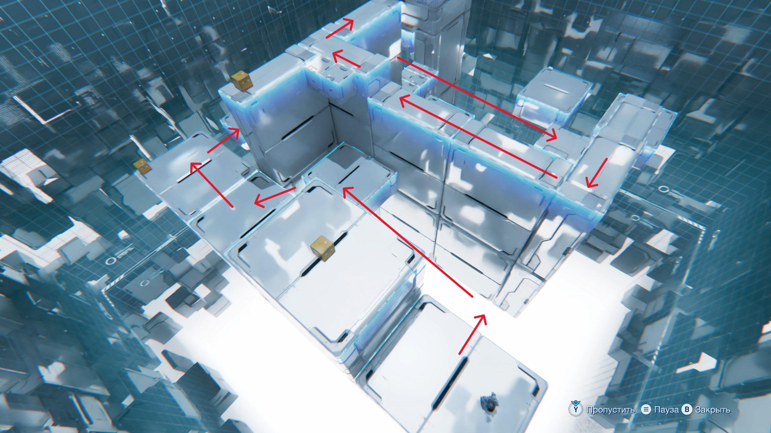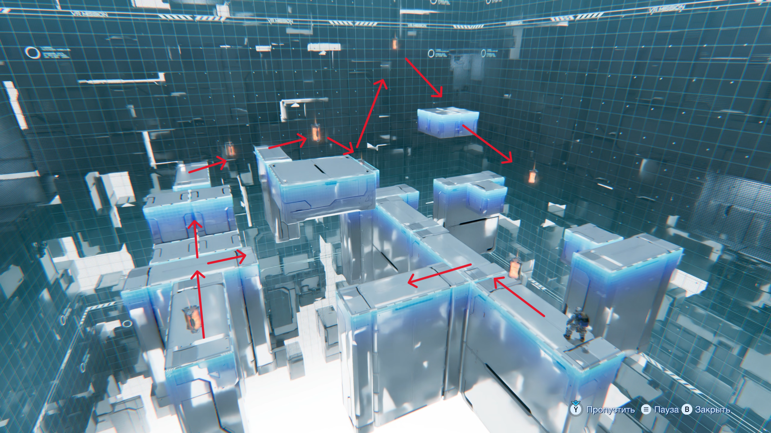 Как и обычный «Мастер замков», это испытание целиком завязано на взломе, но условия стали жёстче. Нужно не только быстро пройти маршрут, но и ни разу не провалить взлом. Сразу после старта прыгайте по диагонали влево, чтобы на опережение запрыгнуть на движущуюся платформу впереди, и взламывайте первый терминал на синей площадке. Затем перепрыгивайте туда, а с неё — сразу на следующую движущуюся платформу.