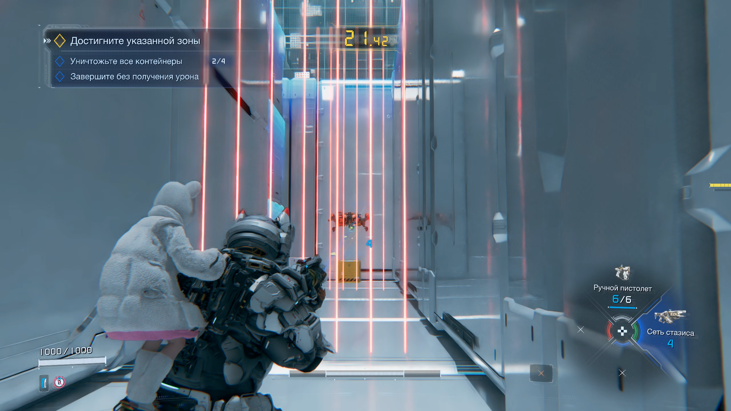 Пополните заряд «Сети стазиса», подобрав новое оружие с пола, и бегите по следующему коридору вслед за лазерной решёткой. Затем выстрелите из «Сети стазиса» в контейнер впереди. Заодно вы обездвижите усиленного Наблюдателя над ним.