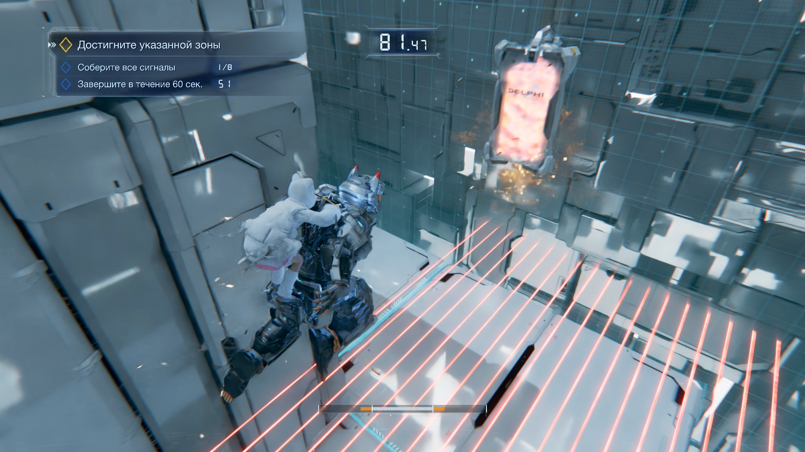От стартовой платформы прыгайте вперед на следующую, а затем прыгайте и делайте рывок налево к платформе, где расположен второй сигнал. Рывок обязателен, потому что к этому моменту лазер будет на третьем ряду и иначе вы не успеете перепрыгнуть со второго на третий ряд, чтобы не получить урон и забрать третий сигнал.