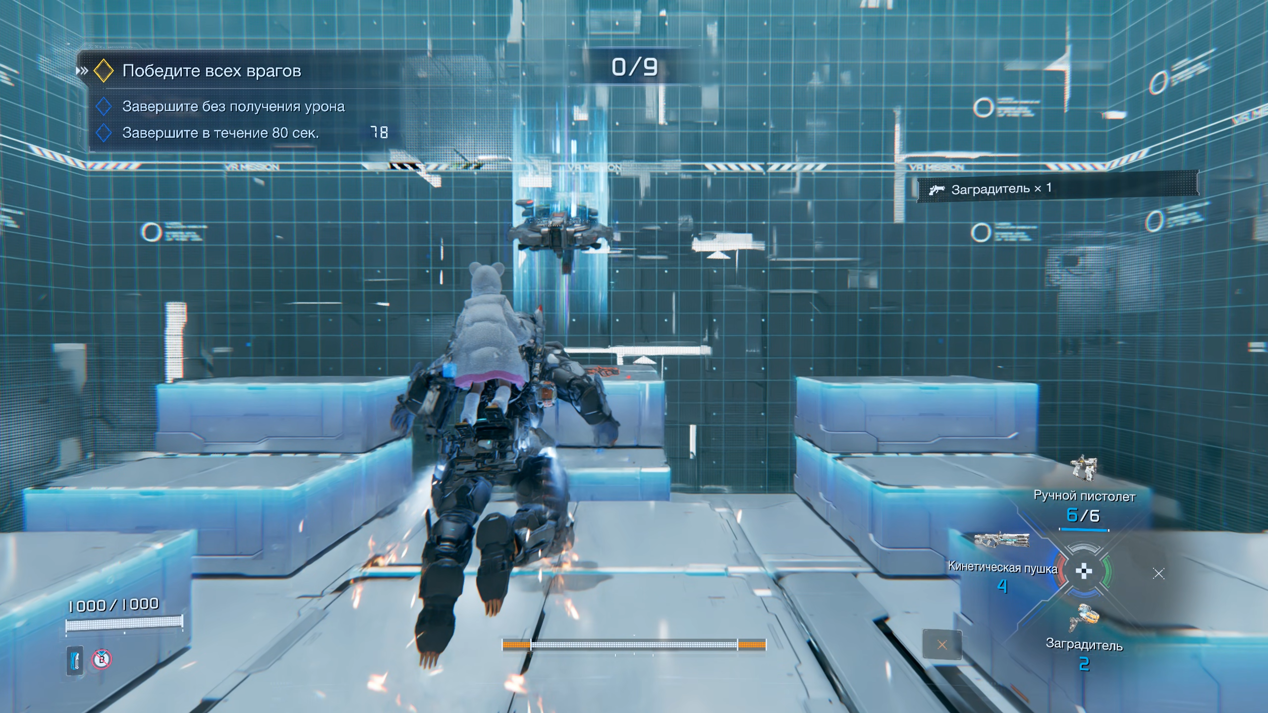 Перепрыгивайте через следующие две платформы и выстрелите в Наблюдателя из кинетической пушки. После этого развернитесь в противоположную сторону и выстрелите в контейнер на движущейся платформе.