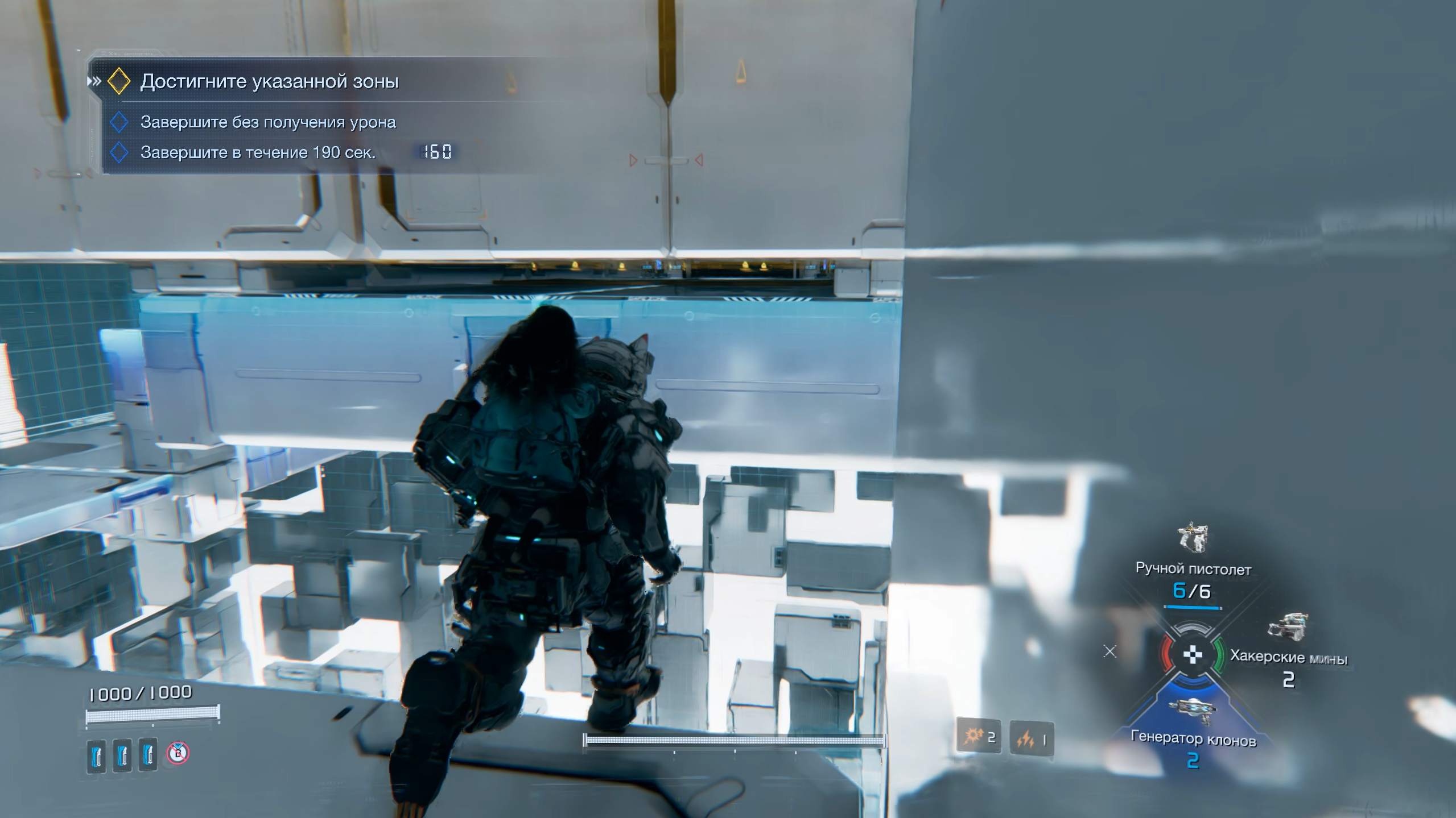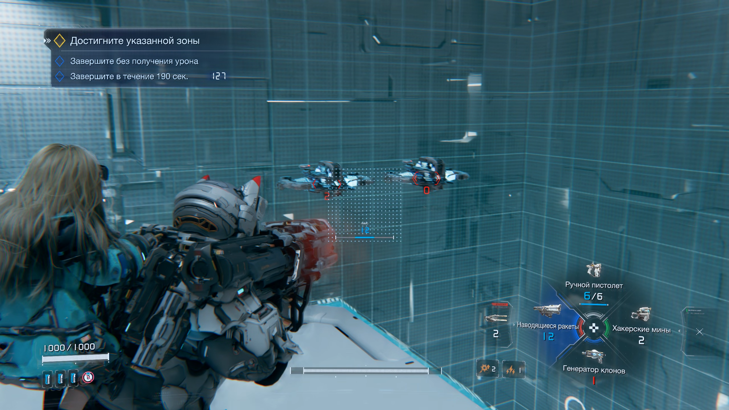 На старте Генератор клонов, Хакерские мины и узлы взлома «Уязвимость» и «Зависание». Пройдите вперёд к двери, и, когда начнут появляться Обходчики, запустите Хакерскую мину прямо по центру между двух устройств, откуда выйдут враги. Взломайте её и наблюдайте за результатом. Если всё сделали оперативно и правильно, мина подорвётся, и противники остановятся. Их можно добить из пистолета, а можно подождать, пока они очнутся, вновь попадут под воздействие мины и умрут.