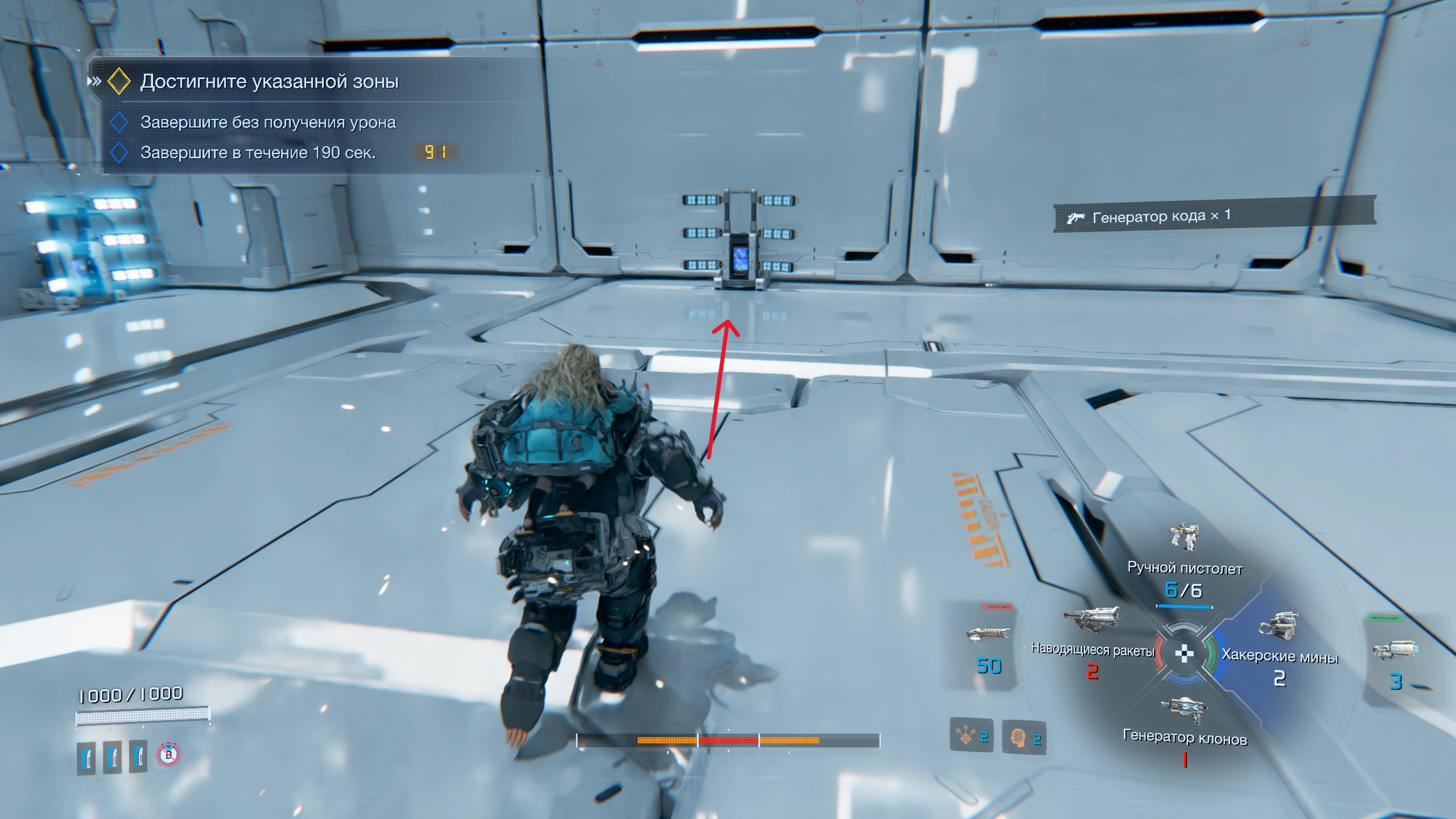 Разобравшись с противниками, спрыгивайте к двери слева и бегите вперёд. Забирайтесь на подъёмник, минуя лазеры, и подбирайте узлы взлома «Мультивзлом» и «Смятение», а также Фотонный лазер и Генератор кода. При входе на арену начнут появляться противники, и здесь требуется как можно быстрее разместить мину в зоне, указанной на скриншоте, чтобы первая волна противников, состоящая из Обходчиков MK-II, подорвалась ровно в тот момент, когда все трое выйдут из устройства в углу.