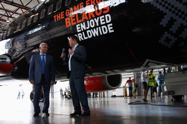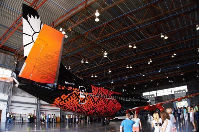 Покраска самолета осуществлялась на чешском заводе в Остраве (было потрачено 300 литров краски и 450 квадратных метров трафарета), откуда он направился прямиком в Минск, где приземлился и заехал в ангар под объективами камер журналистов.