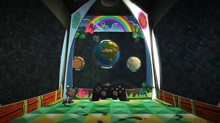 После загрузки камера упирается в небольшой домик из картонной коробки, в котором обитает маленький, языкастый сакбой (Sackboy). Из предметов обстановки — только контроллер SIXAXIS, но никто не мешает квартирку раскрашивать и декорировать. За окошком болтается три «планетки». Одна служит для просмотра информации о достижениях себя любимого и друзей, ознакомления с новостным каналом. Другая — та самая LittleBigPlanet, через которую открывается путь на уровни разработчиков и пользователей. Третья — своя Луна, куда можно копировать пользовательские уровни для их последующей модификации или наполнять «кратеры» собственными творениями.