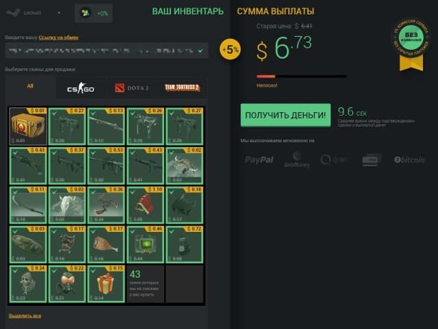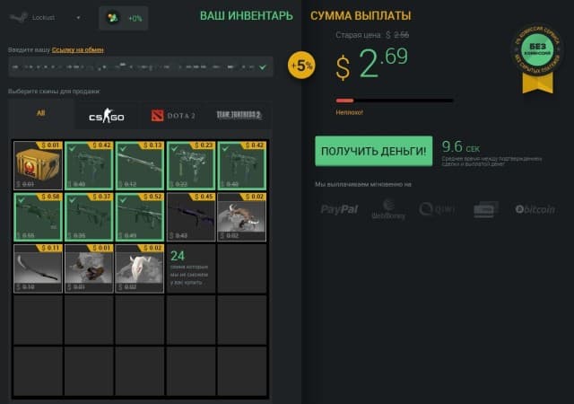 В целом сайты, подобные Skins.Cash, позволяют легко и быстро конвертировать ненужный вам хлам в деньги. Само собой, речь не идёт об огромных суммах. Жить на это вы не сможете, даже если посвятите всё время игре в Counter-Strike: Global Offensive, Dota 2 или Team Fortress 2. Однако копеечка лишней не бывает, особенно в преддверии больших зимних распродаж в Steam.