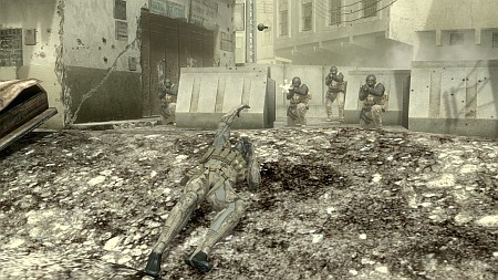 Одним из первых заданий Снейка на Среднем Востоке будет «добраться до точки встречи с информаторами». Поскольку уровни в MGS4 имеют разветвленную структуру, добраться до цели можно несколькими путями. Например, «приняв влево», Снейк вскоре окажется в переулке, заблокированном отрядами солдат во главе с огромным БМП, вооруженным автоматическим крупнокалиберным пулеметом. Эта «машинка» простреливает всю улицу в пределах видимости, и начинает огонь моментально, едва кто-то чужой оказывается в зоне поражения. Конечно, можно попробовать прорваться с боем, добраться до ракетницы, и вывести бронетехнику из строя… Или же пойти другим путем. Выбрав правый маршрут, Снейк вообще сможет избежать контакта с солдатами, зато ему вдоволь придется поползать на животе по развалинам зданий, пробираясь через рухнувшие балки и перекрытия.