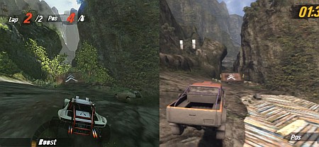 А вот с графикой ситуация парадоксальная. То, что мы видели в роликах, то, о чем с восторгом отзывались журналисты, людям, скачавшим публичную демо-версию Motorstorm Paсific Rift, распробовать не удалось. Куда-то пропало солнце и световые эффекты, повыдергивали растительность и оставили голые скалы вперемешку с мутными текстурами. Собственно, пользователи уже сделали сравнения того, что показывали журналистам и во что сейчас играют рядовые граждане. Смотрите сами.