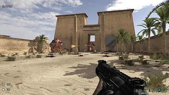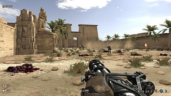 Иногда происходящее скатывается в последовательность неудачных эпизодов. Одни моменты кажутся неуместными. Другие словно делали, не доделали, да вырезать пожалели. К третьим очевидно должна прилагаться какая-то инструкция, но таковой нет. Подобные отходы от традиции и попытки сделать из игры нечто большее, чем мясной аркадный шутер, сильно портят впечатление.С оружием тоже случилось что-то непонятное. Чувствуется влияние Call of Duty. Появились автоматы армейского образца, перезарядка и точное прицеливание. Дробовик логичнее смотрелся бы в руках какого-нибудь морпеха. Об источнике вдохновения в лице военных шутеров напоминают заряды C4 с дистанционным управлением и гранатомёт. В остальном героя поджидают хорошо знакомые игрушки вроде двустволки, пулемёта и супер-пушки, стреляющей ядрами.Хорошо хоть авторы не отказались совсем от своего наследия. Нет-нет, но встречаются арены величиной с десяток футбольных полей с разбросанными аптечками, броней и грудами патронов. Враги материализуются со всех сторон и несутся оравой навстречу свинцовому ливню. На Сэма набрасываются хорошо знакомые скелеты, зомби-солдаты, скорпионы с пулемётами, шагающие роботы, в небе кружат устрашающего вида демонессы и монструозного вида вертолёты.Окружение крошится под натиском ракетных залпов, превращая древние города в голое поле. Окровавленные исполины падают на землю, одним метким выстрелом получается отправить на тот свет сразу десяток-другой рядовых монстров, пулемёт замолкает, только когда заканчиваются патроны.Излишняя красочность осталась в прошлом, а на кровавое мясо авторы не поскупились. Удар кувалды оставляет в туше неприятеля огромную дыру, ядро способно разорвать буйвола напополам, камикадзе после взрыва разлетаются на куски. Кроме этого Сэм освоил нехитрые добивания. Он топчет мелких жучков, сворачивает шеи детёнышам скорпионов или вырывают глаза монстрам.