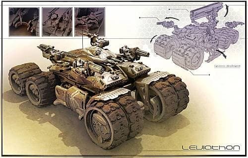 Во главе сухопутных ударных сил стоит Leviathan - гигантских размеров танк, оснащённый пятью посадочными местами для игроков. Водитель более всего защищён от вражеского огня, поскольку скрывается внутри корпуса. Ему подвластно не только управление многотонной махиной, но и энергетическая пушка, позволяющая вести огонь преимущественно во фронтальном секторе. Оставшиеся четыре места предназначены для стрелков. Бойцы занимают позиции у турелей и могут вести огонь практически по всем направлениям. Поскольку турели располагаются снаружи танка, стрелки гораздо более уязвимы для вражеского огня. Однако, каждое «посадочное» место оборудовано собственным энергетическим щитом, позволяющим отражать вражеские атаки. Естественно, рано или поздно щит «провиснет», и тогда стрелок погибает, однако на остальных его товарищах это никак не скажется - каждая боевая «ячейка» выводится из строя персонально. Кроме того, стрелки смогут варьировать тип вооружения, при помощи которого ведётся огонь, что позволит им наиболее эффективно отражать атаки разноплановых сил противника. Изюминка Левиафана состоит в том, что даже будучи начисто лишённым стрелков, он представляет из себя грозное оружие поддержки. Водитель переводит машину в стационарный режим, и танк превращается в мощнейшую артиллерийскую установку, позволяющую вести огонь по всей территории карты. Мощи энергетическим залпам не занимать, единственный минус Левиафана в данном режиме - полная неподвижность.