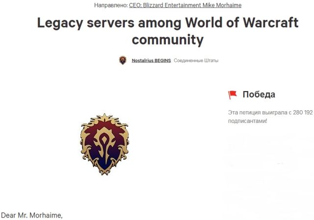 Nostalrius был закрыт по инициативе Blizzard и усилиями юристов через суд. В связи с этим огромное количество подписей собрала петиция с требованием вернуть «ванилу».