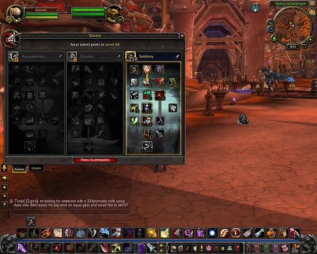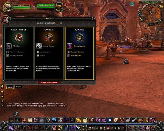 Сильно была переработана система талантов. На 10 уровне вам предлагается выбрать одну из трех специализаций. Каждая из них дает определенное уникальное умение и пассивные бонусы. Например, разбойник со специализацией талантов Combat получит способность для ведения боя сразу с двумя противниками, бонус к атаке оружием в левой руке и бонус к регенерации энергии. А разбойник, что выберет специализацию Subtlety, получит способность телепортации к противнику за спину, бонус к ловкости и бонус к урону после выхода из режима стелса. В общем, каждая специализация теперь предполагает действительно другой стиль игры за любимый вами класс. Количество талантов было урезано до 31 очка на ветку, а получает очко таланта игрок теперь только через один уровень. Cataclysm несет в себе не только изменения механики игры. Технологически WoW тоже не стоит на месте. Blizzard в очередной раз заимствует лучшие идеи у создателей адд-онов. Интерфейс статистики персонажа стал еще шире, мини-карта обросла дополнительными маркерами, появился полноценный помощник по миссиям: места дислокации нужных монстров, предметов и NPC отмечаются на карте.