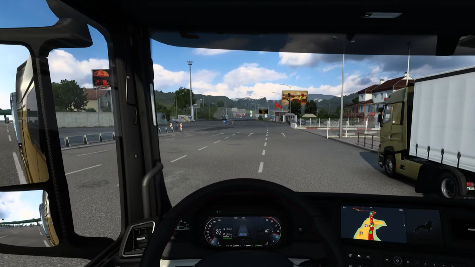 Путь виртуального водителя в Euro Truck Simulator 2 начинается на контрольно-пропускном пункте. После проверки документов он продолжает движение: проезжает несколько мостов, наблюдает местные красоты.