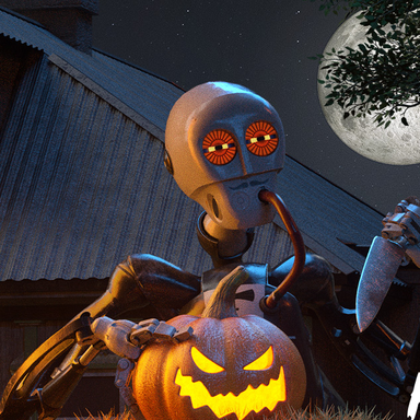Обычно на таких праздничных артах Atomic Heart появляются Близняшки в разных образах, но в данном случае в кадре оказался совсем другой робот — РАФ-9 Инженер (или «Рафик»). Также можно заметить «тыквоголового», который держит отрубленную голову.
