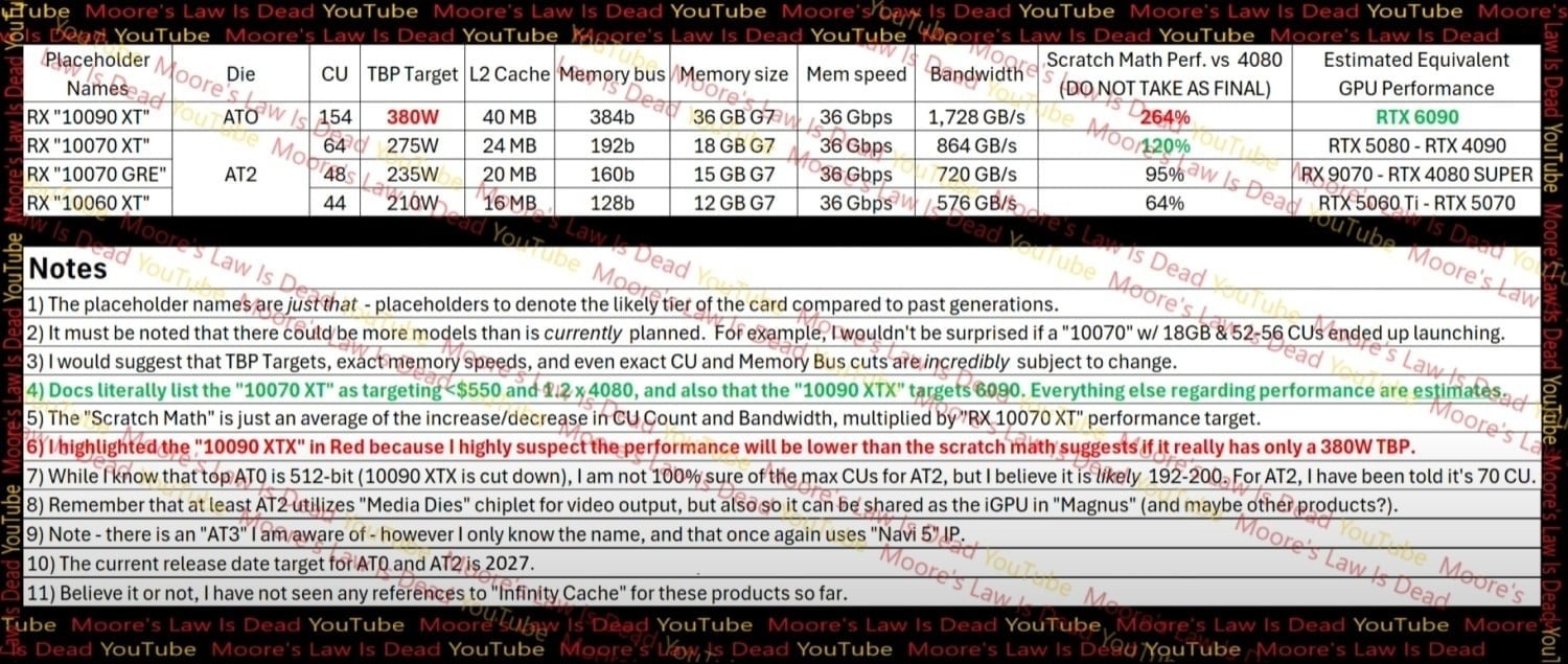По данным MLID, RDNA 5 разделяется на два кристалла: AT0 и AT2. Консоли получат AT2 с 40–48 CU на частоте 3.0GHz+, что примерно соответствует производительности между RX 9070 и RTX 4080 SUPER.