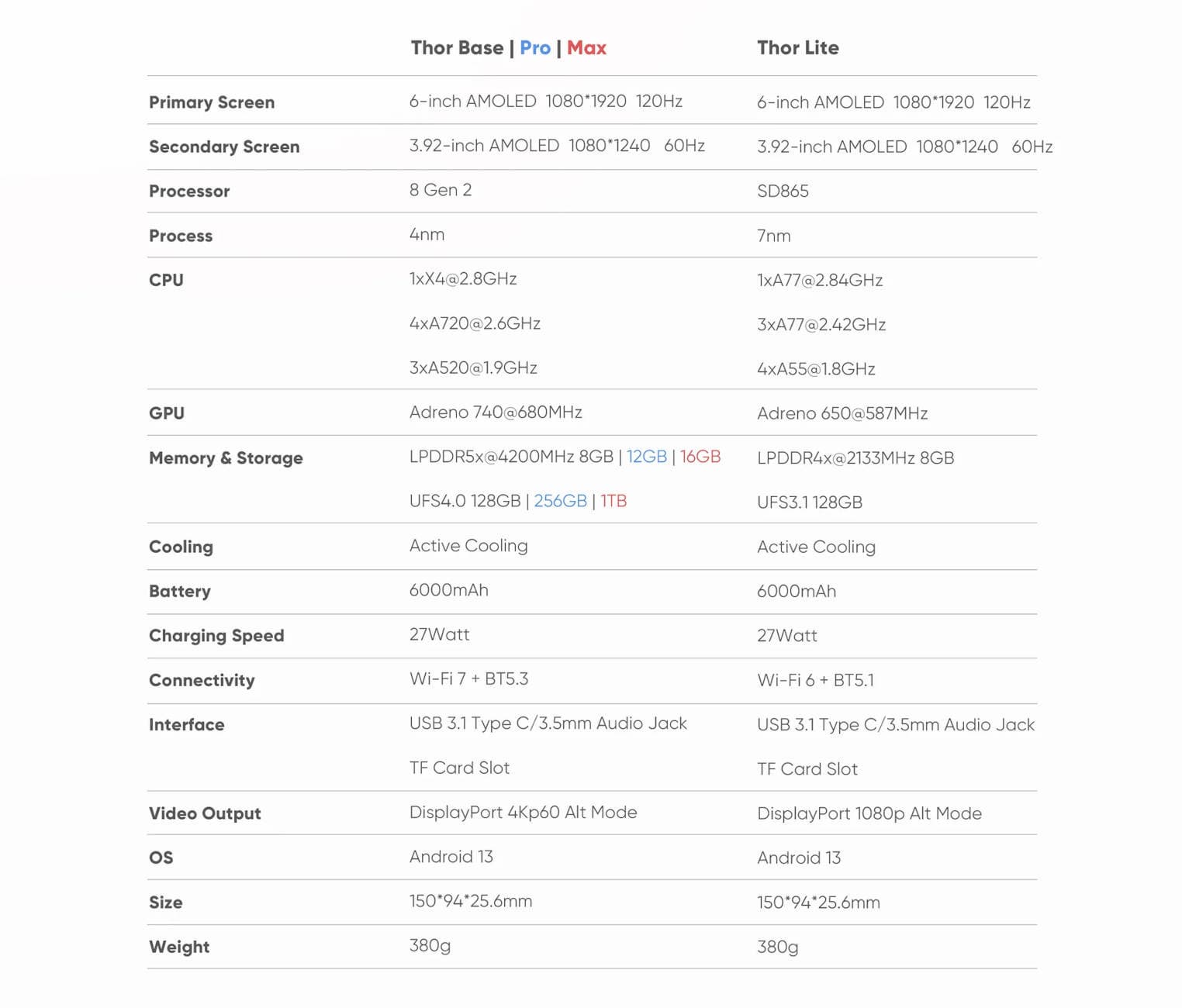 The Base, Pro, and Max versions received a Snapdragon 8 Gen 2 chip, which has eight cores – 1xX4@2.8GHz, 4xA720@2.6GHz, 3xA520@1.9GHz, Adreno 740@680MHz graphics processor, active cooling, LPDDR5x@4200MHz RAM (8GB | 12GB | 16GB), built-in UFS4.0 memory (128GB | 256GB | 1TB), 6000 mAh battery (charging speed – 27 Watts), Wi-Fi 7 and BT5.3.