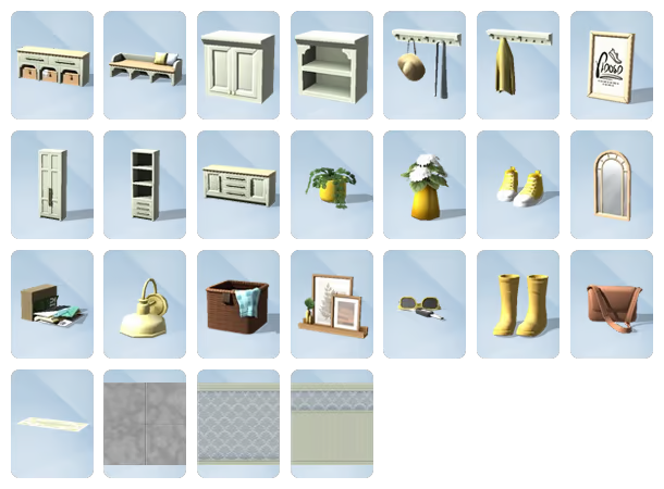 Grange Mudroom Kit («Сельская прихожая»): «Создайте и украсьте в своем доме идеальную прихожую с помощью разных предметов, декора, а также настенного и напольного покрытия. Она отлично впишется в стиль жизни владельцев ранчо и горожан, которые любят садоводство и активный отдых».