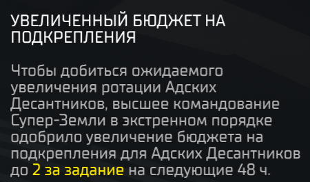 Мы едины в нашей любви к Супер-Земле, ведомые твердой рукой управляемой демократии. Как легендарные адские десантники другой Великой войны, мы с головой бросаемся в ад — потому что именно там идет самая ожесточенная борьба. Спасения не будет. Отступления не будет. Только вы, вместе против врага.
