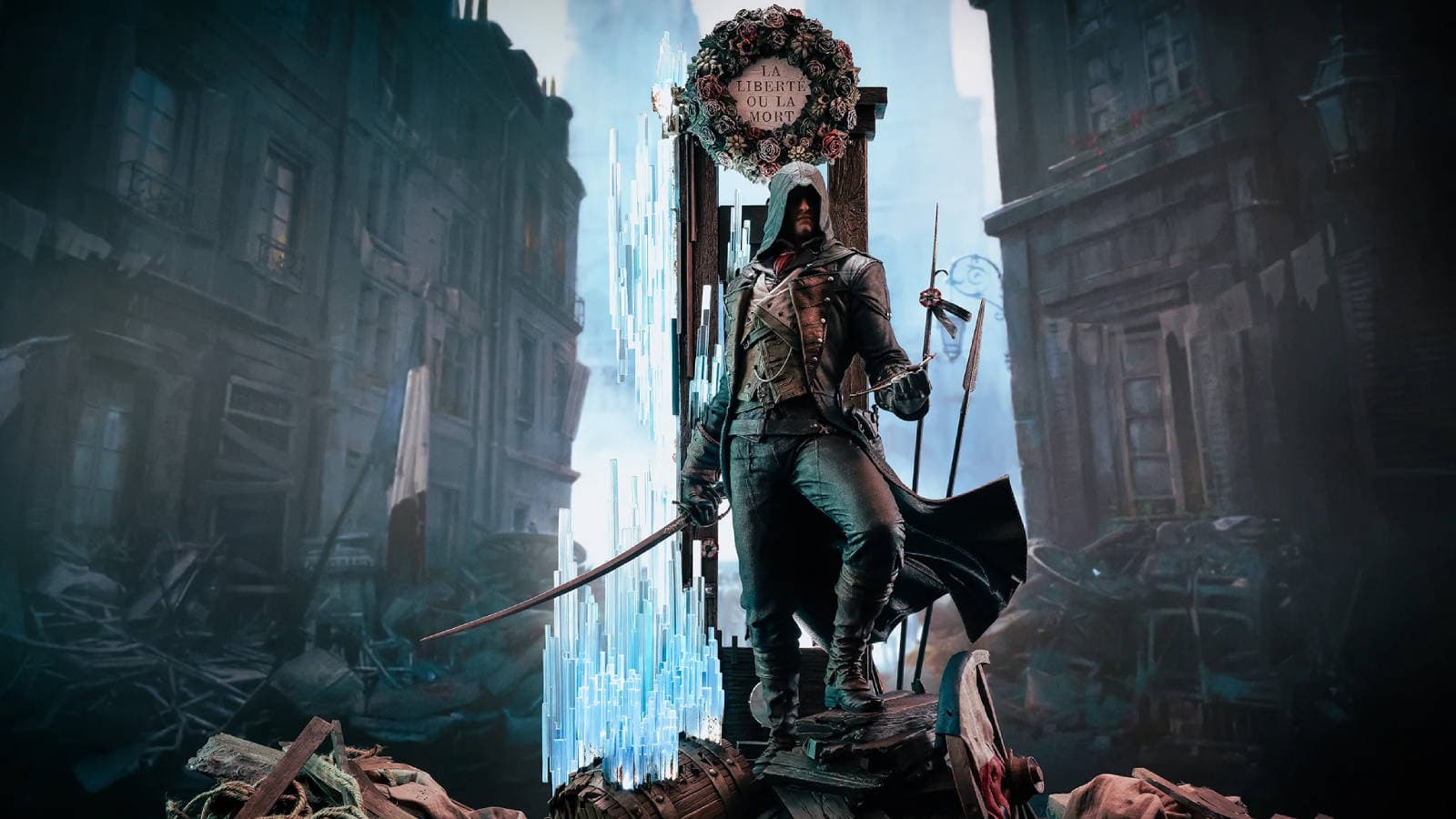 The creators of this collectible item, which features LED lighting, captured the moment when Arno, the main character of Assassin’s Creed Unity and a member of the French Brotherhood of Assassins, stands with weapons in hand in front of the guillotine, which is adorned with a wreath of flowers and the inscription "Freedom or Death."