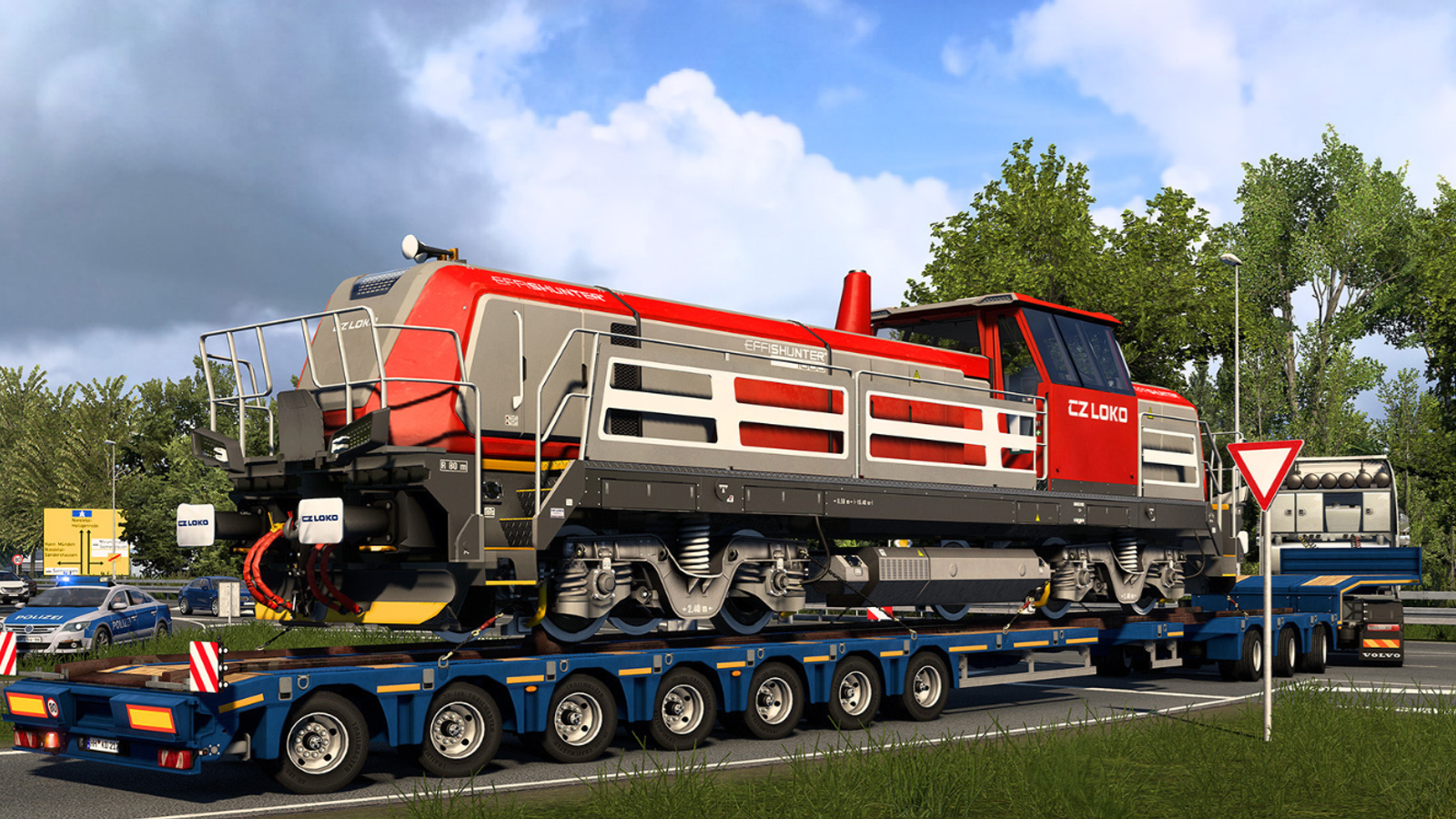 "EffiShunter 1000, a huge locomotive built by CZ LOKO. Truckers will transport this monster on a low-loader semi-trailer. Just how big is it? The overall height (including the trailer) reaches an impressive 5.3 meters, the length is 16 meters, and the width is 3.1 meters. Navigating turns with the EffiShunter 1000 in tow will require precision and nerves of steel."