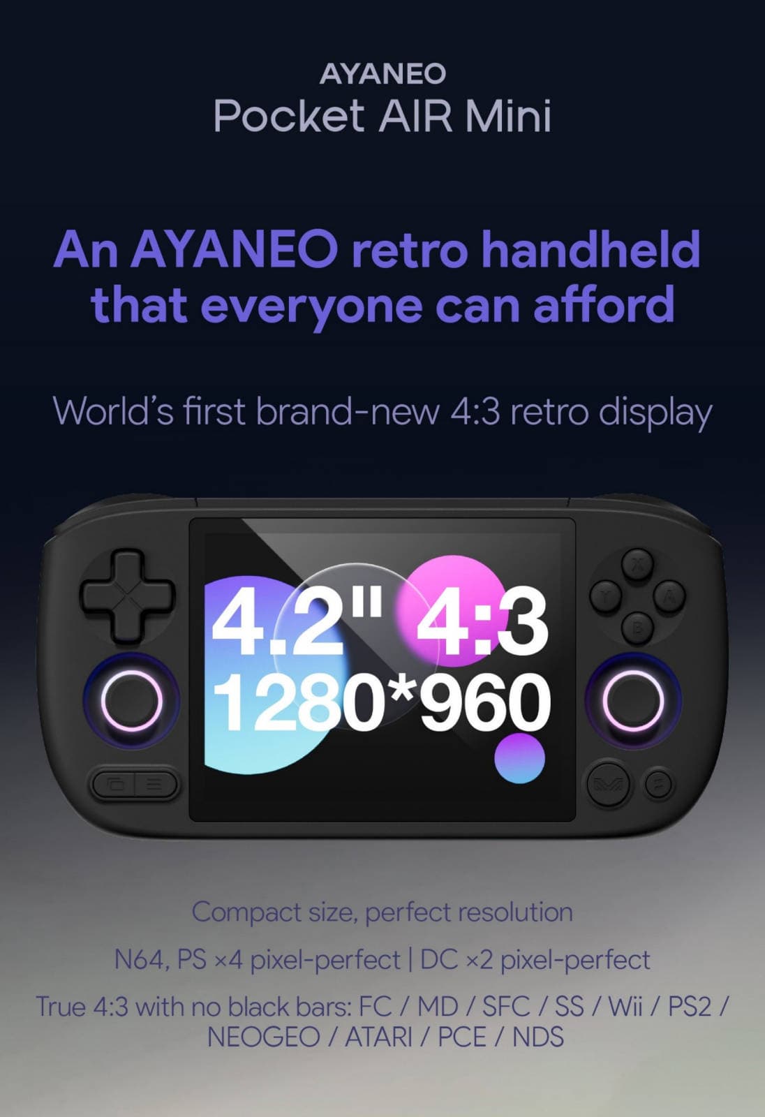 According to Arthur, the FC (Nintendo Entertainment System or NES), MD (Sega Mega Drive), SFC (Super Nintendo Entertainment System or SNES), SS (Sega Saturn), Wii, PlayStation 2, NeoGeo, Atari, PCE and Nintendo DS systems run on Ayaneo Pocket Air Mini without black bars around the edges of the screen.