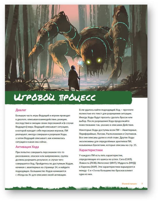 Some people call this tabletop game "DW minus D&D" or "Dungeon World without unnecessary D&D attributes". Many conventions of classic TTRPGs have been removed from the game: no outdated characteristics like "Constitution" or counting Health Points, no inventory overload with gold, equipment lists, racial restrictions, or moralizing worldview. Plus, there is a solo mode.