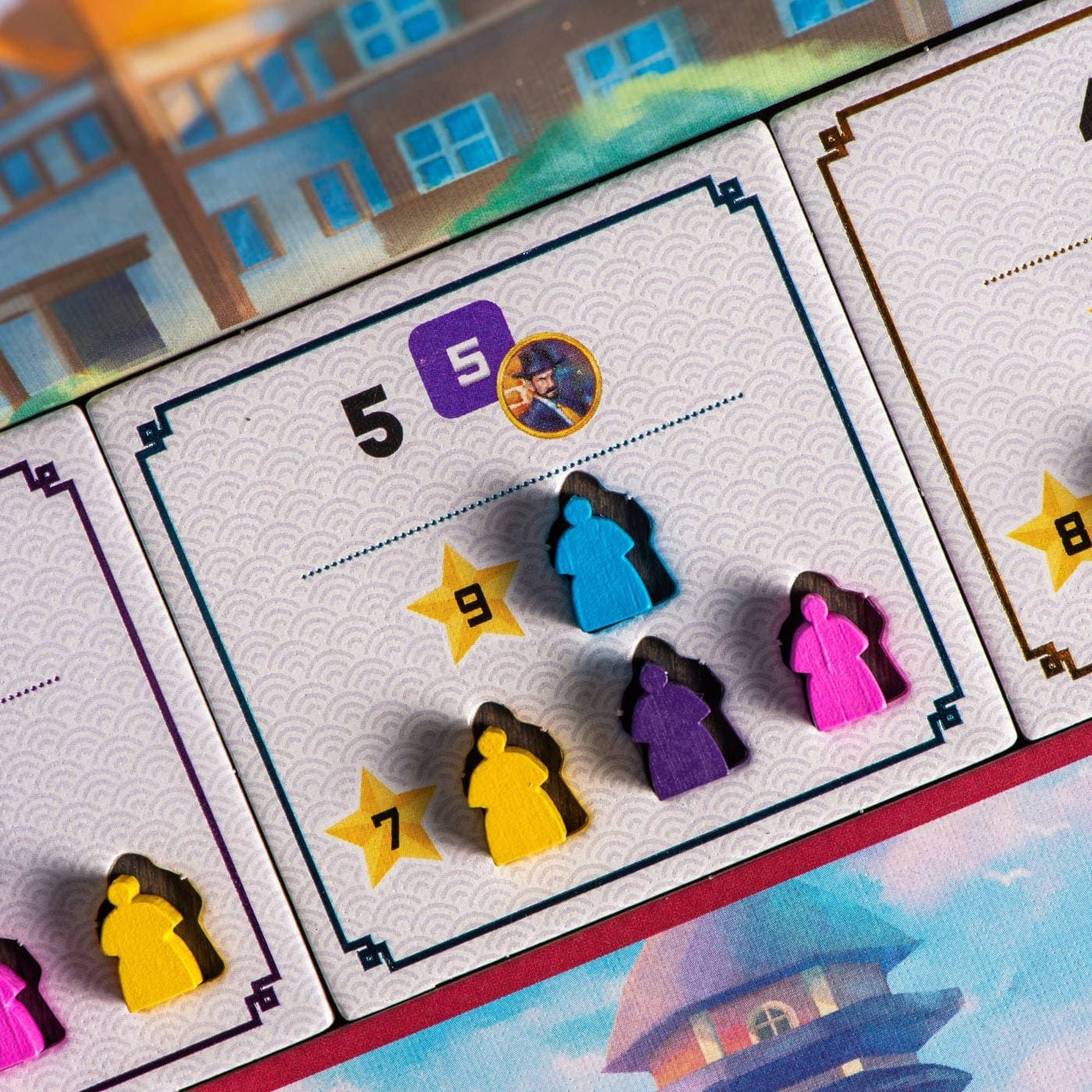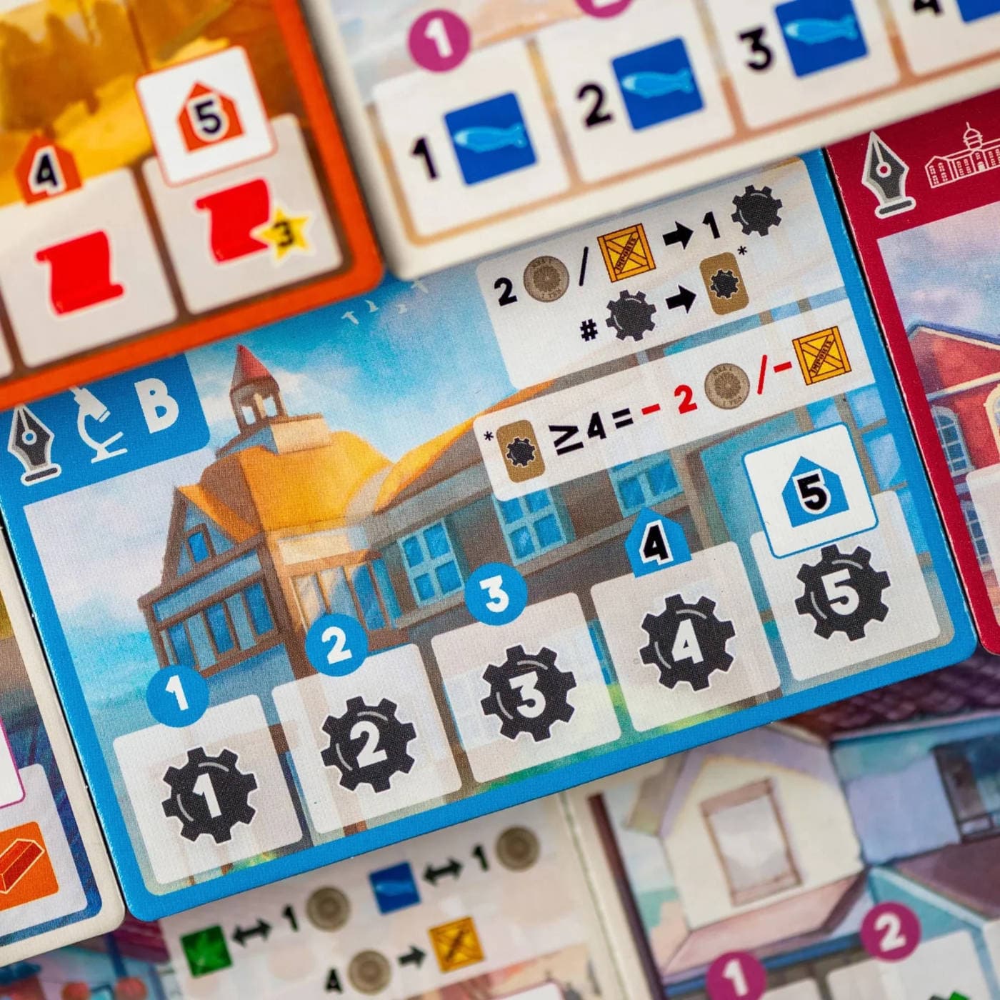 Yokohama, which scored 7.8 out of 10 on the BGG portal, has a modular field that changes from game to game, a movement and influence mechanic (you have to activate zones, collect resources, and build commercial facilities).