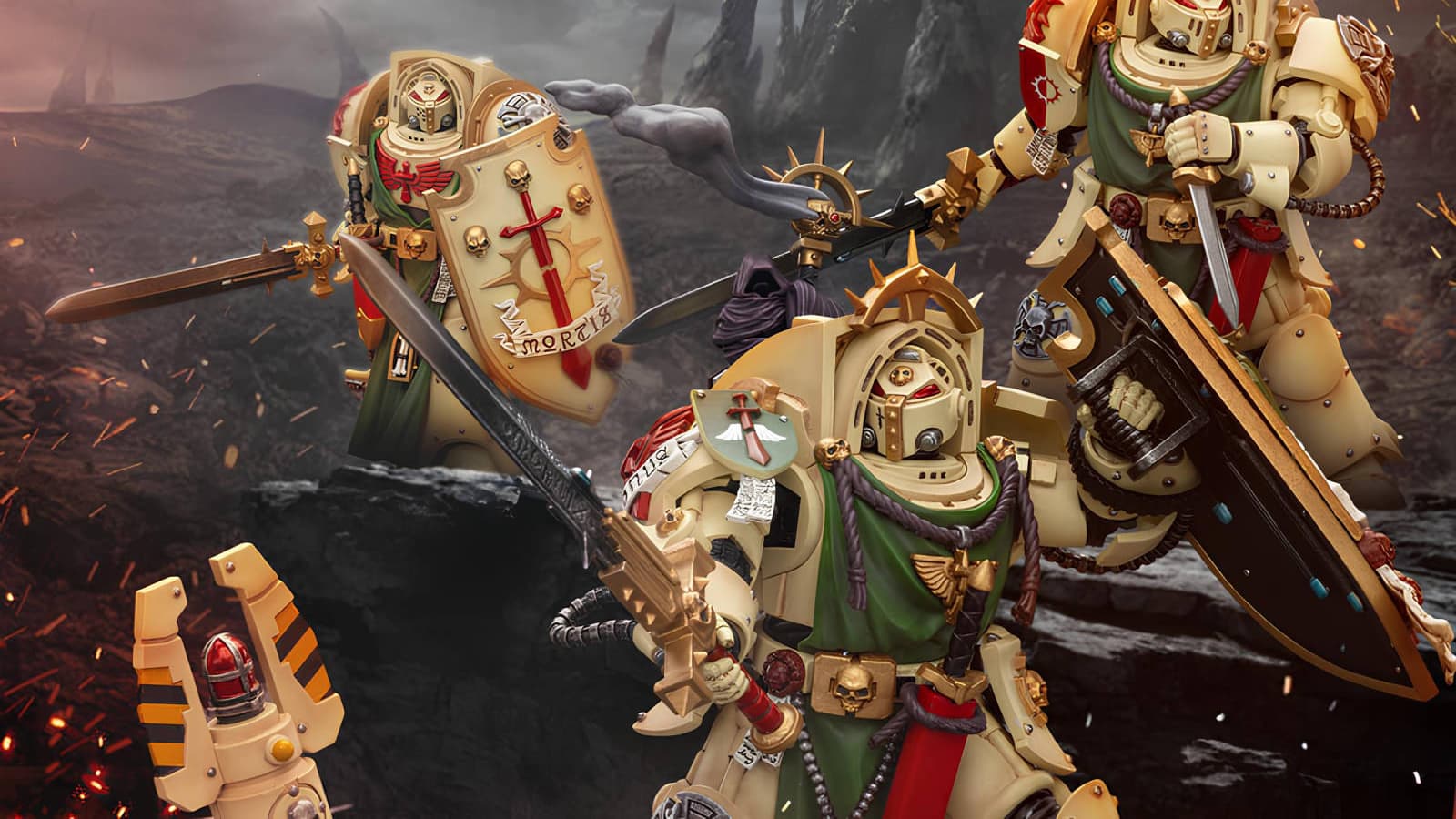 The Dark Angels chapter is getting reinforcements as JoyToy unveils 1/18 scale Deathwing Knights figures, complete with power swords and shields, a teleport homer, and a Watcher in the Dark.