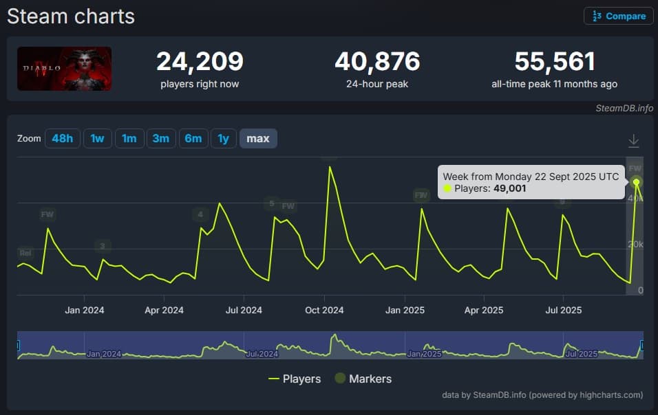 Blizzard launched a large-scale promotion: a 55% discount and free days for newcomers. The result was impressive - at its peak, 49,000 people played simultaneously on Steam, which surpassed the figures of all past seasons. The only larger surge in online activity was during the release of the Vessel of Hatred expansion. According to fans, free access played a minimal role - similar promotions in the fifth and seventh seasons did not yield the same result.